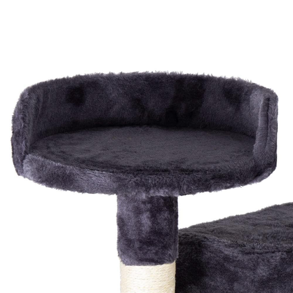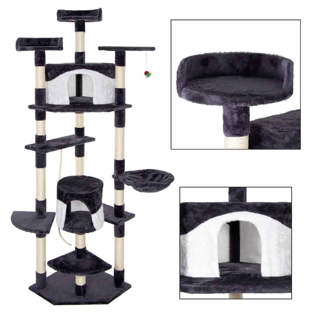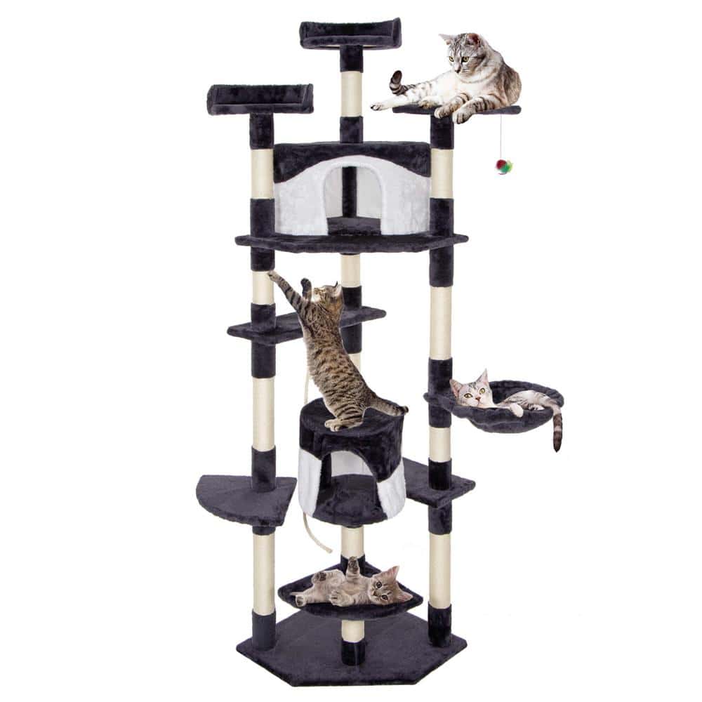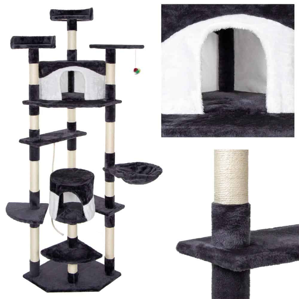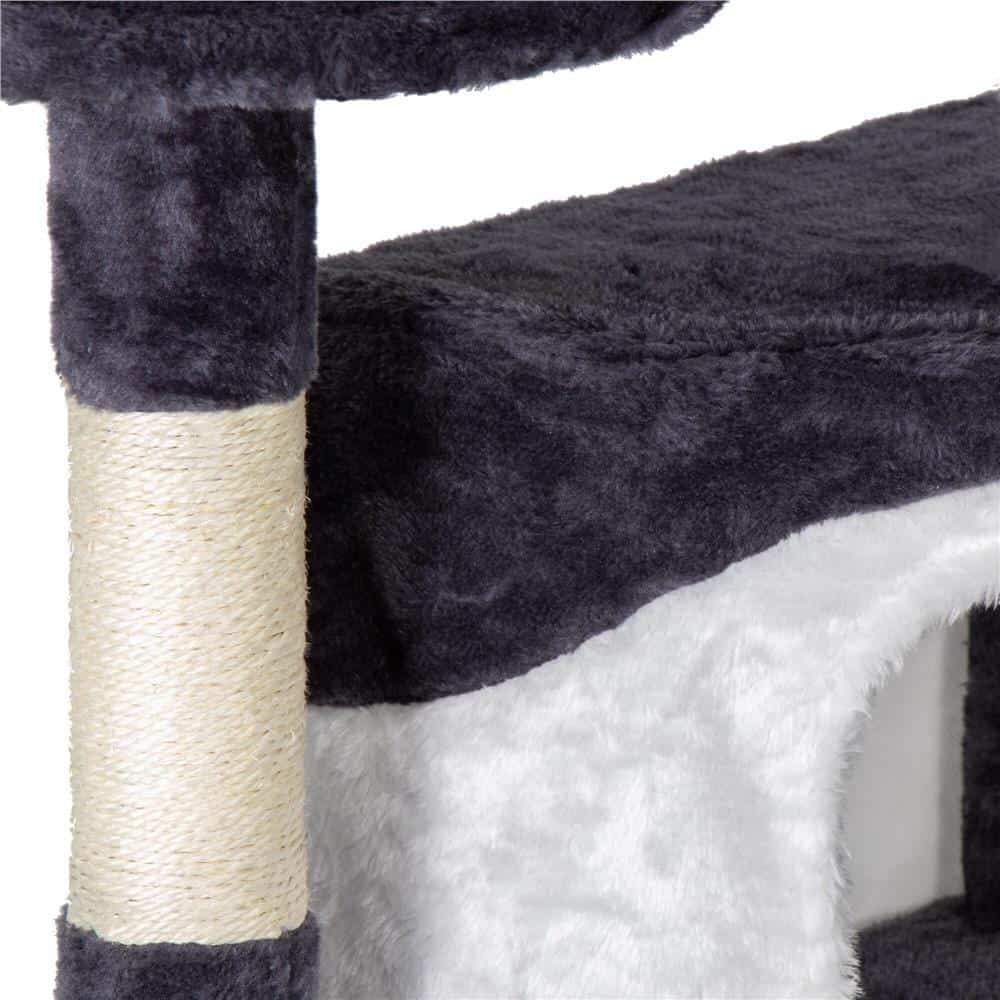 Ansamblu de joaca pentru pisici, cu loc pentru zgariat, ascuns, culcus, minge, sfoara, 203cm, gri inchis Mob360