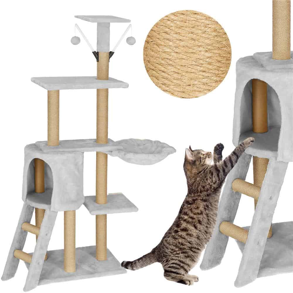 Ansamblu de joaca pentru pisici, cu loc pentru zgariat, ascuns, culcus, soricei, 136cm, gri Mob360