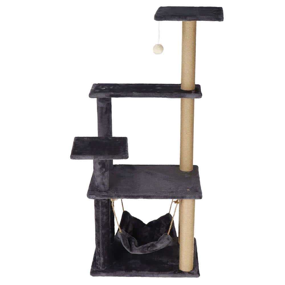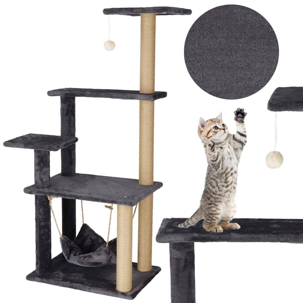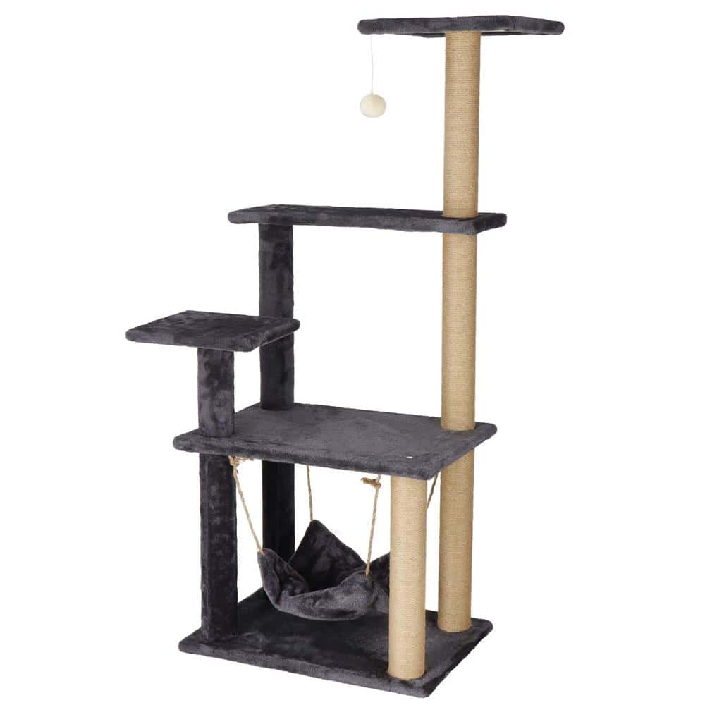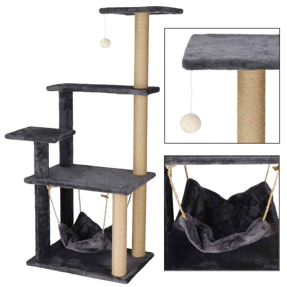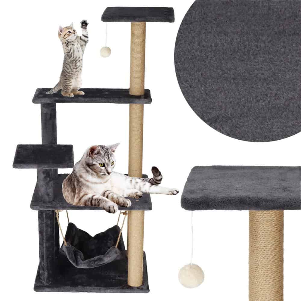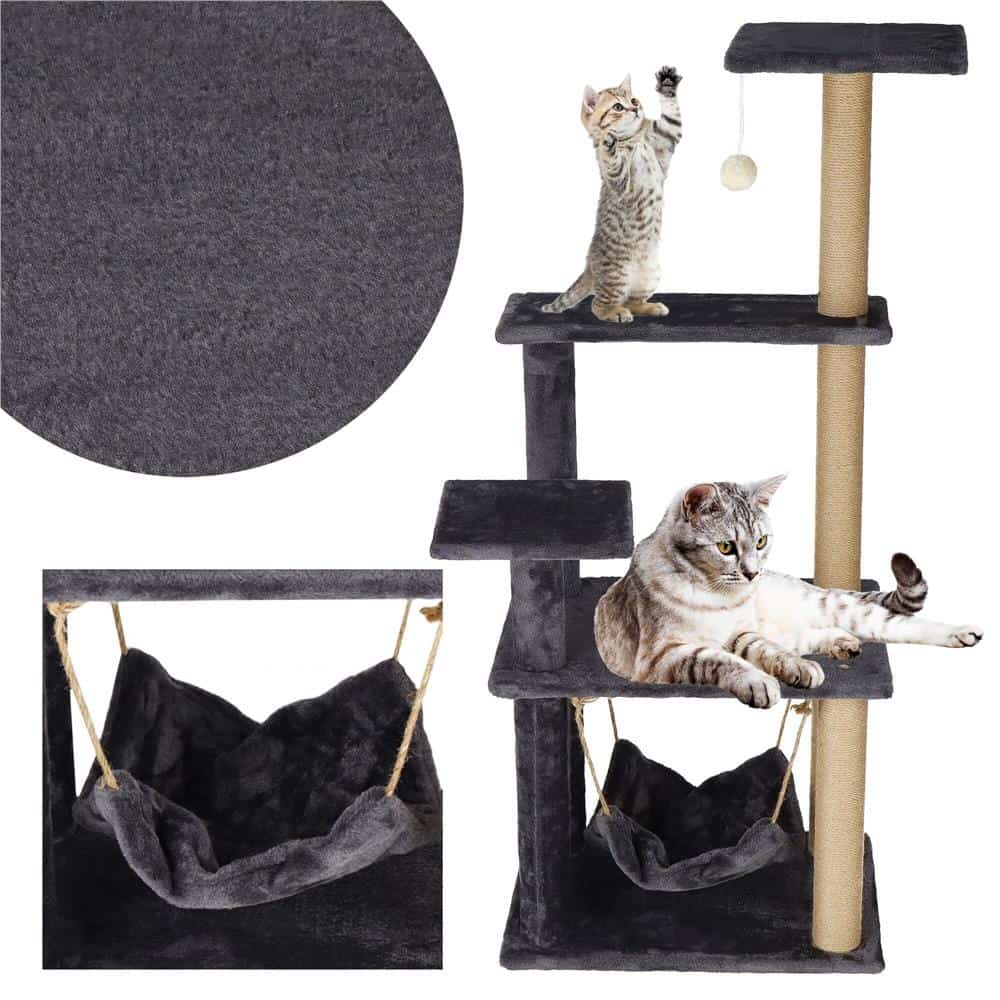 Ansamblu de joaca pentru pisici, cu loc pentru zgariat, hamac, minge, 121cm, grafit Mob360
