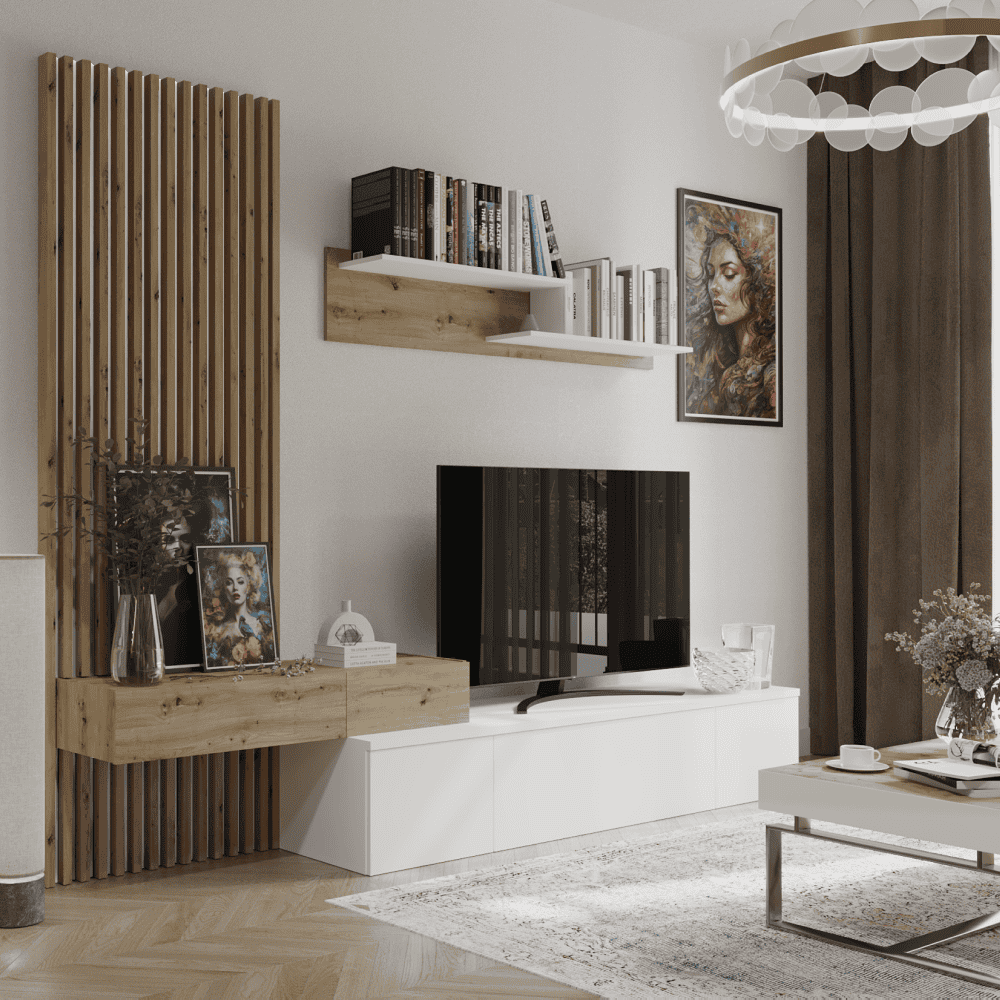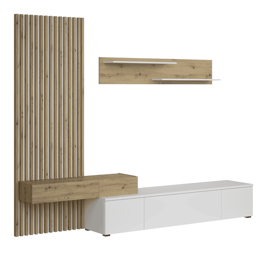 Material: PAL melaminat Material margini: hârtie impregnată cu polimeri termorigizi Culoare: albă / stejar Artisan Dimensiuni (LxAxÎ): 249,5x42x199,5 cm Dulap suspendat (LxAxÎ): 110×33,7×16,1 cm Raft (LxAxÎ): 140×20,4×26 cm Măsuţă TV (LxAxÎ): 180×42,2×32,5 cm Panou lamelar (LxL): 69,4×199,5 cm Grosime material: 1,6 cm Grosimea lamelelor: 2,2 cm Cu picioare din plastic Uşa se deschide cu un mecanism ?push-up? Livrat dezasamblat