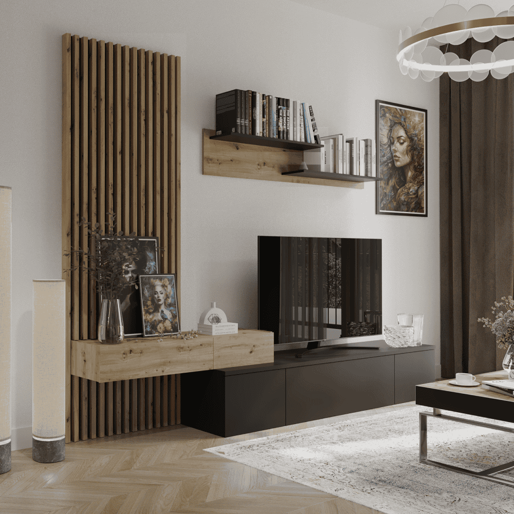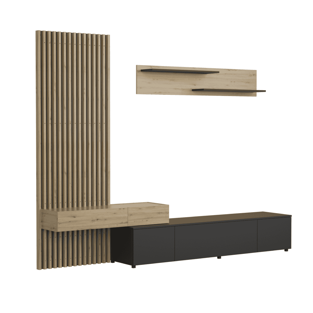 Material: PAL melaminat Material margini: hârtie impregnată cu polimeri termorigizi Culoare: negru/stejar Artisan Dimensiuni (LxAxÎ): 249,5x42x199,5 cm Dulap suspendat (LxAxÎ): 110×33,7×16,1 cm Raft (LxAxÎ): 140×20,4×26 cm Măsuţă TV (LxAxÎ): 180×42,2×32,5 cm Panou lamelar (LxL): 69,4×199,5 cm Grosime material: 1,6 cm Grosimea lamelelor: 2,2 cm Cu picioare din plastic Uşa se deschide cu un mecanism ?push-up? Livrat dezasamblat