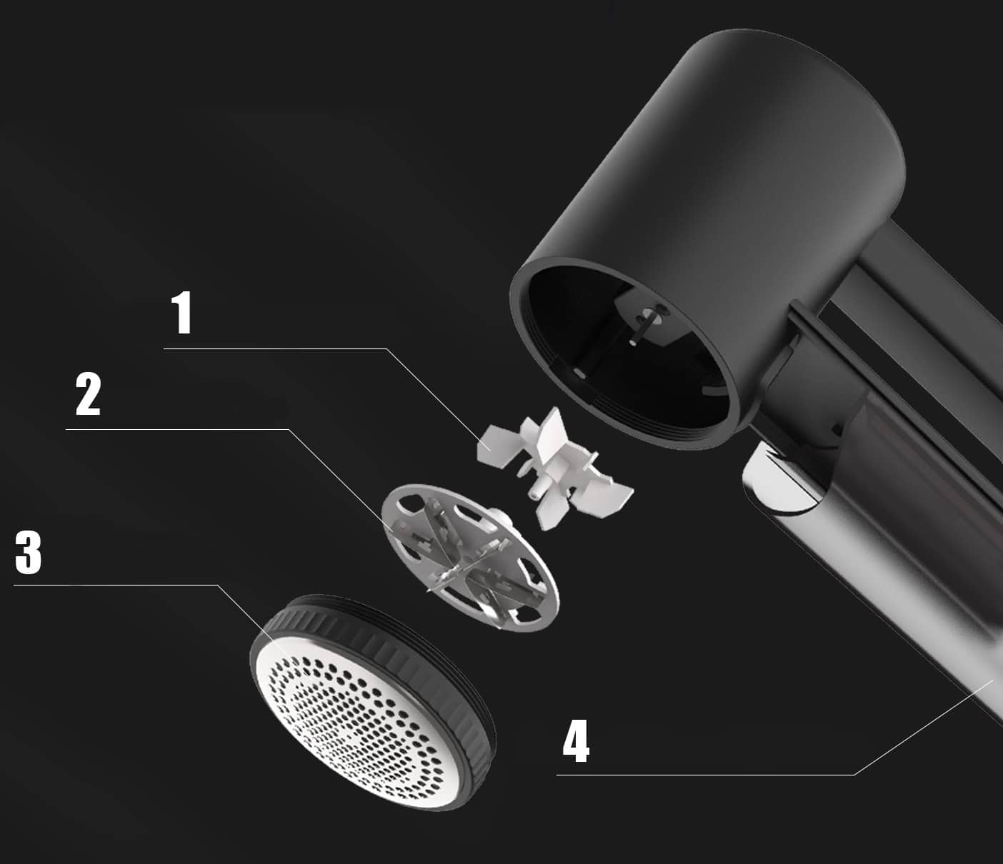 - Aparatul nostru de barbierit are un motor puternic care va permite sa alegeti unul dintre cele trei niveluri de viteza, asigurand un lucru eficient pe diferite tipuri de tesaturi. Lame de taiere rotative ascutite:
