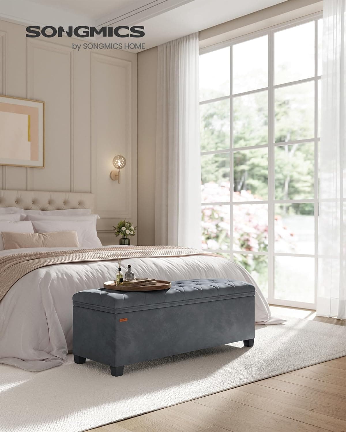 Banca cu spatiu de depozitare 110x40x40 cm, 103 litri, tapitata cu catifea, MDF si spuma, gri Mob360