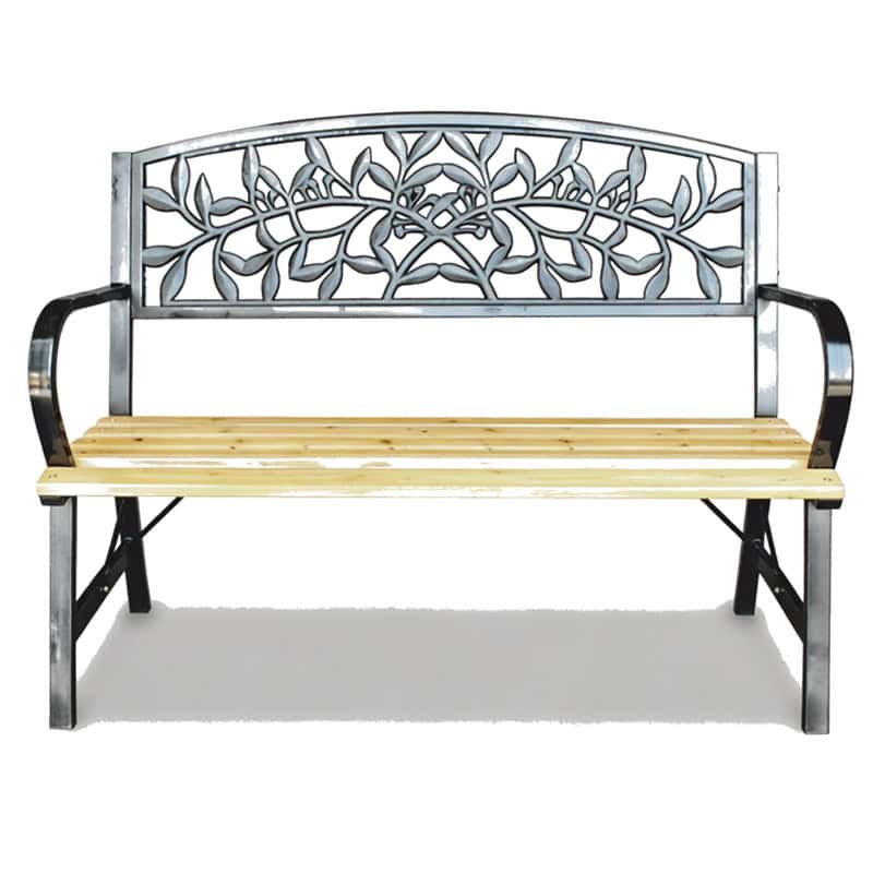 Banca de gradina din lemn si otel cu spatar decorativ model frunze, 120x56x87 cm, negru si maro natur Mob360