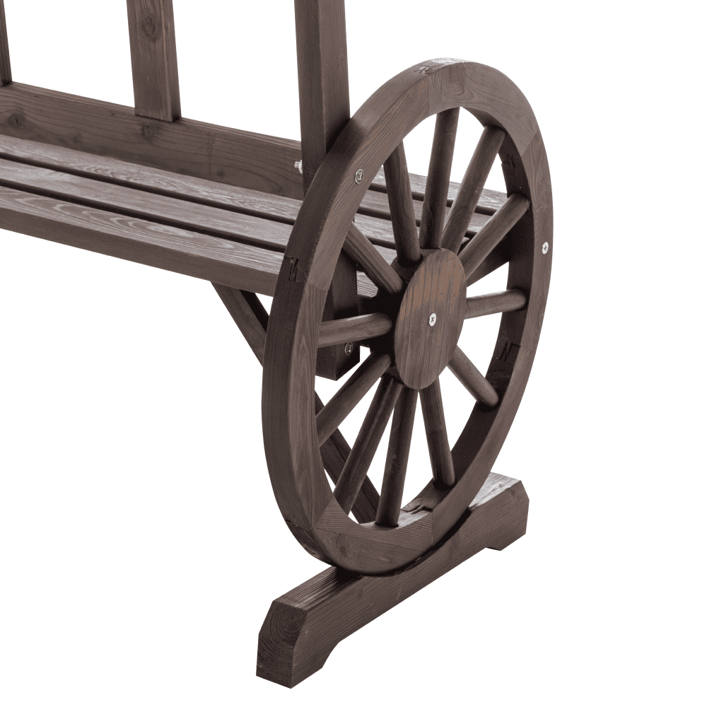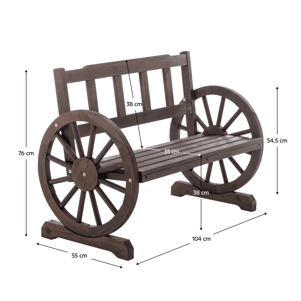 Material: lemn de pin Culoare: gri Dimensiuni (lxAxh): 104x55x76 cm Lăţimea şederii: 95,5 cm Înălţime părţii de şezut: 38 cm Adâncimea şederii: 35 cm Înălţime spătar: 38cm Diametru roată: 54,5 cm Grosime material: 1,8-4,5 cm Portanţă: 170 kg Cotiere sub formă de roată Pentru grădină sau terasă Stil rustic Rezistentă la intemperii Vă recomandăm să protejaţi produsul de intemperii pentru a prelungi durata de viaţă a produsului Livrat dezasamblat