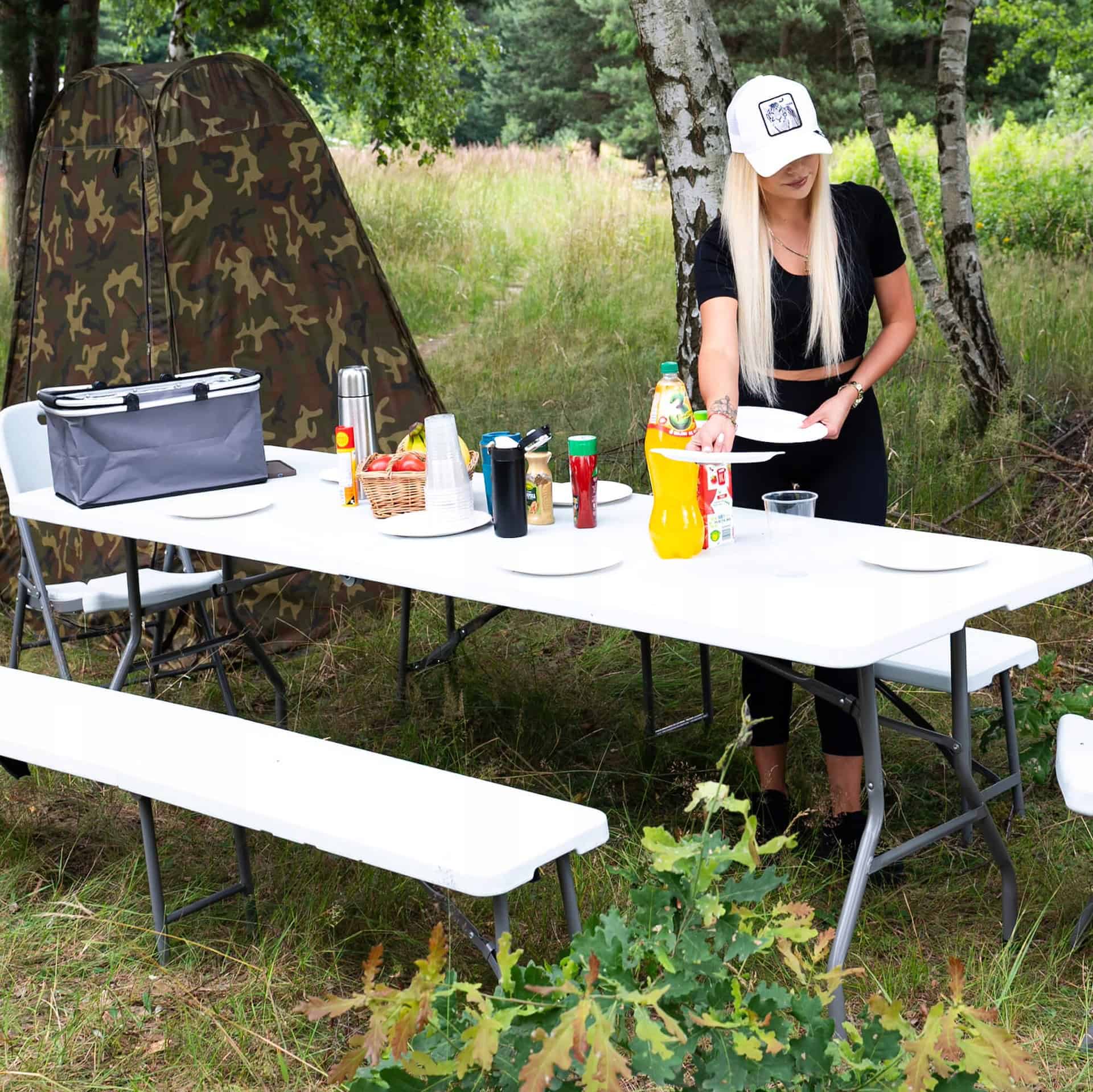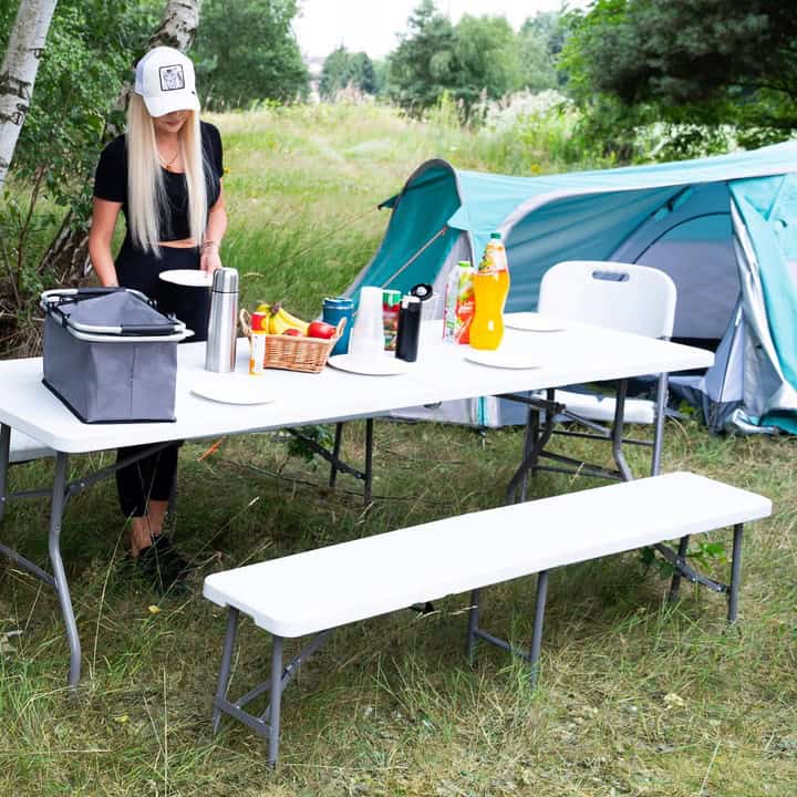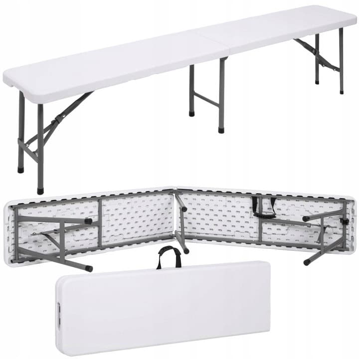 Banca pliabila, cu maner, HDPE si cadru metalic, 180x30x43 cm, alb/gri Mob360 – produs disponibil în magazinul Mob360.