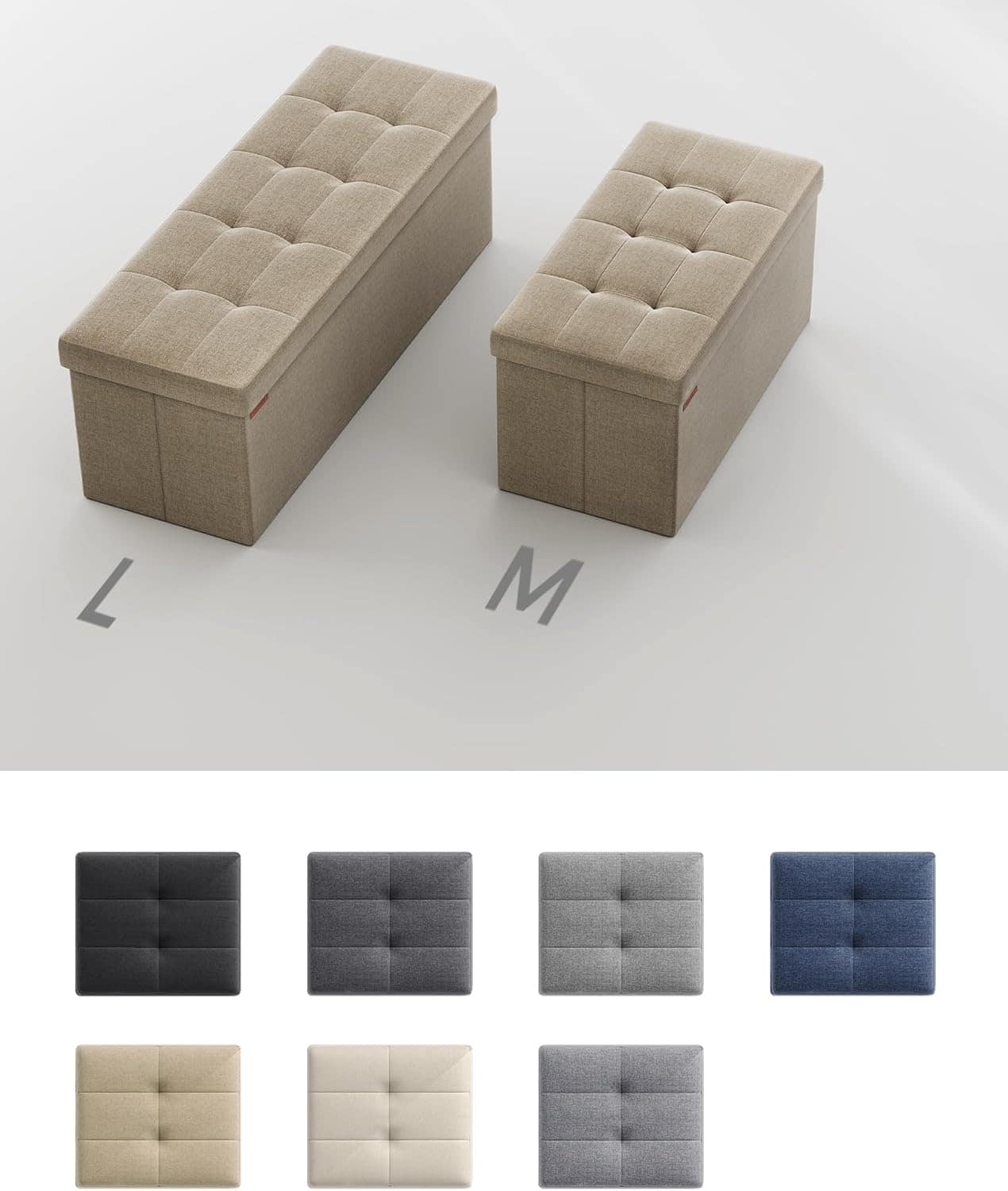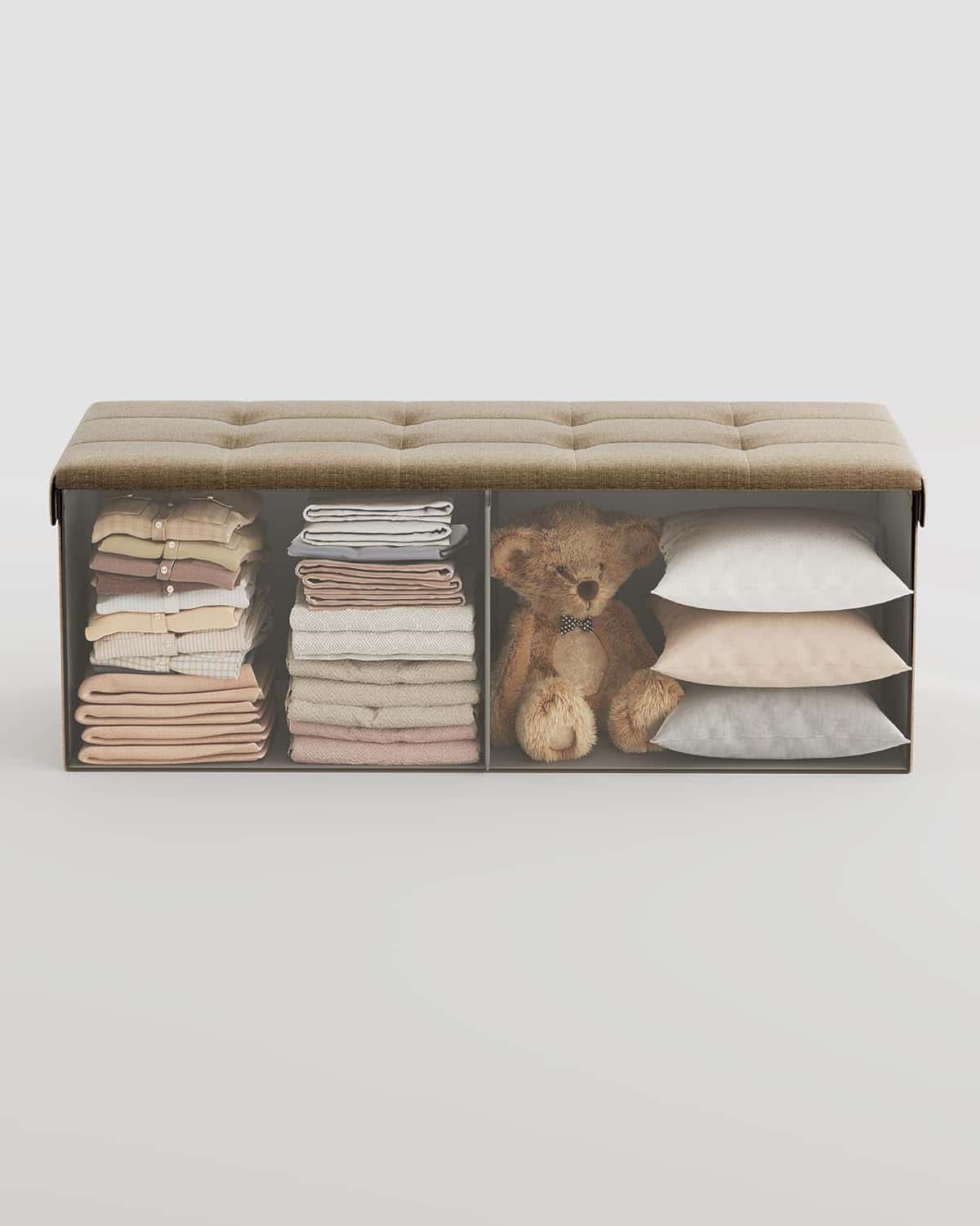 bancheta pliabila cu spatiu de depozitare 110x38x38 cm, MDF si material textil, capacitate 300 kg, maro camel Mob360 – produs disponibil în magazinul Mob360.