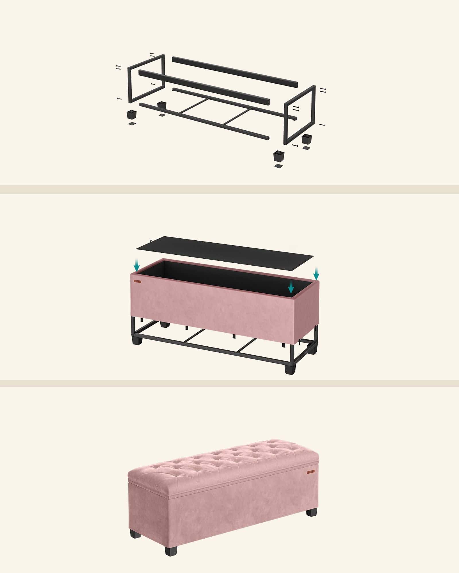 Bancuta depozitare cu picioare, velur matlasat, 103 litri, 110x40x40 cm, roz Mob360
