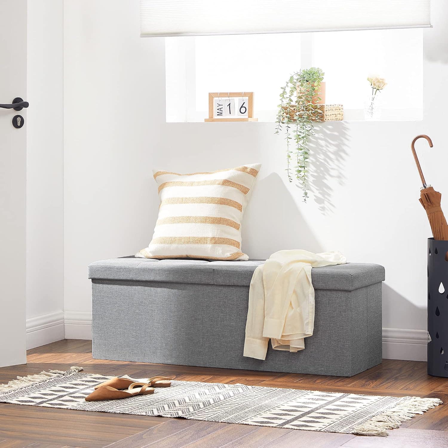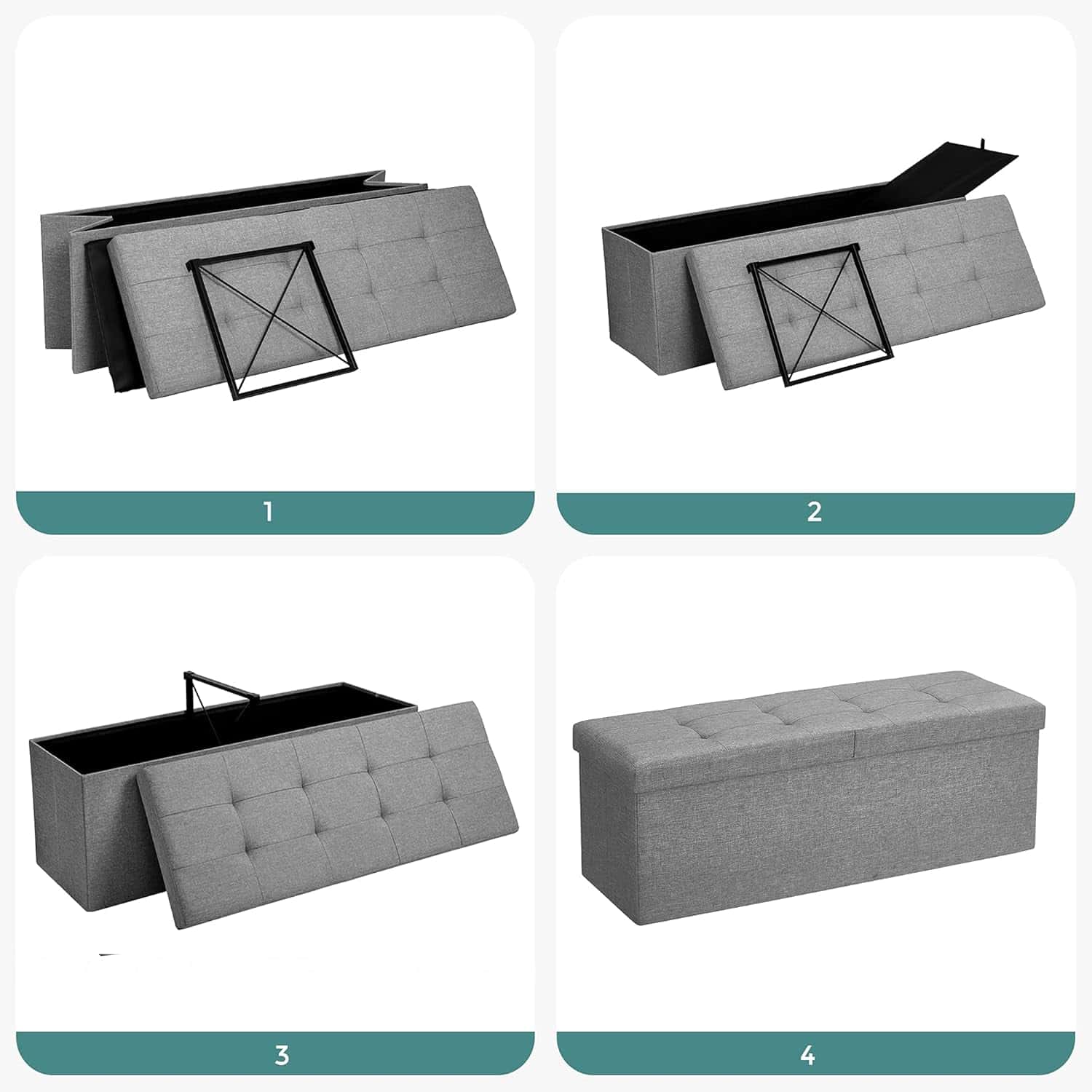 - Aceasta bancuta pliabila de la SONGMICS ofera un echilibru perfect intre design modern si functionalitate. Cu un capac dublu rabatabil si spatiu interior de 120L, este ideala pentru depozitarea lenjeriei, hainelor sau cartilor, oferind totodata un loc confortabil de stat. Caracteristici principale: