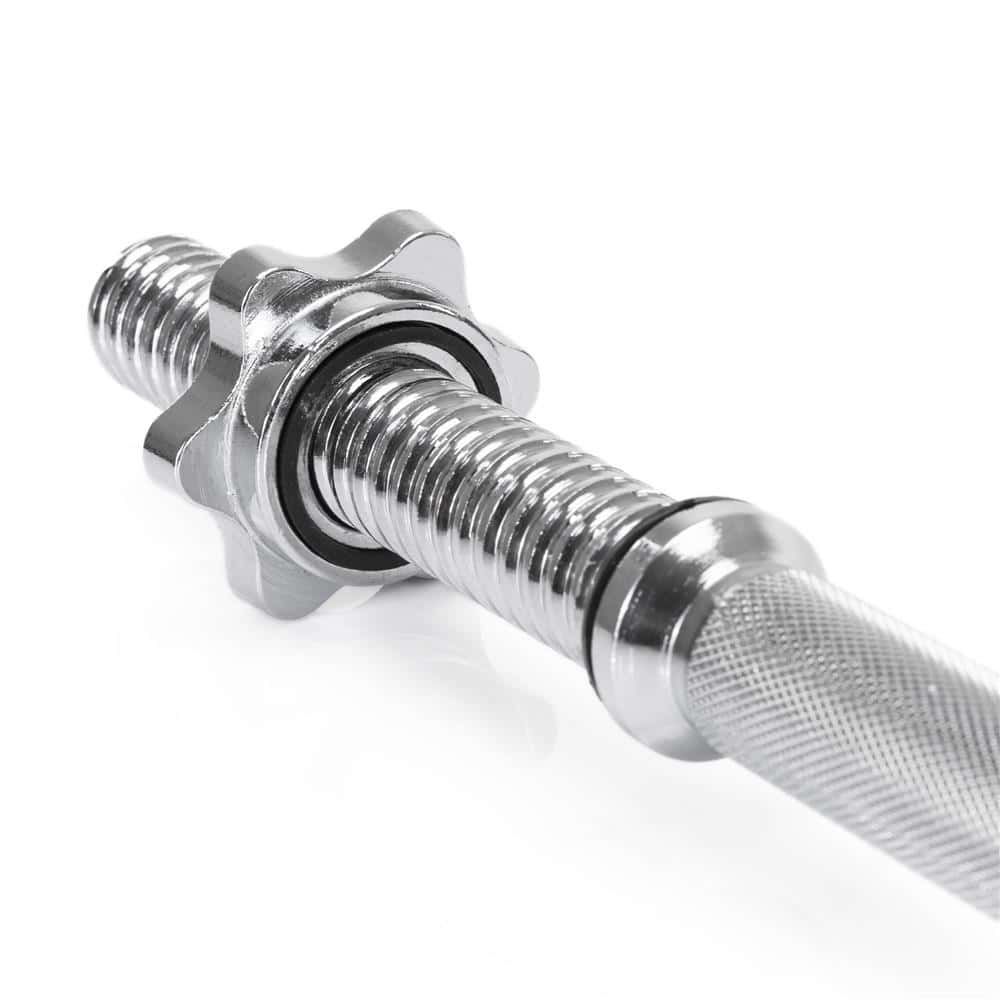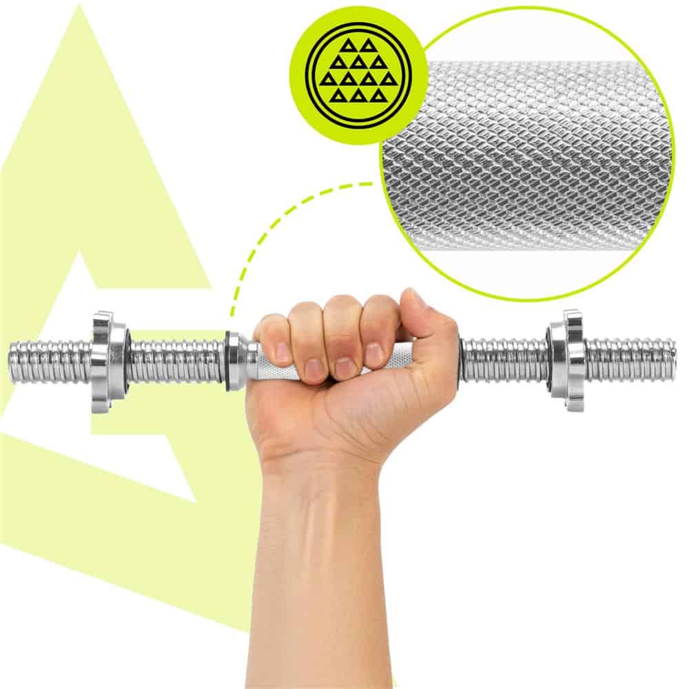 - Bara scurta pentru gantera este realizata din otel cromat rezistent si este destinata antrenamentelor de forta acasa sau la sala. Lungimea de 40 cm si diametrul de 28 mm o fac compatibila cu majoritatea discurilor standard. Manerul antiderapant ofera prindere sigura in timpul exercitiilor, iar colierele filetate fixeaza ferm greutatile pentru un antrenament stabil si sigur. Caracteristici principale: