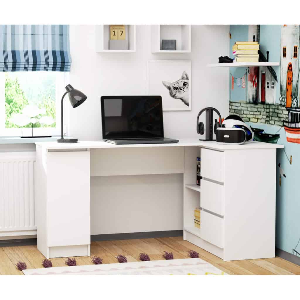 Birou colt dreapta in L cu 3 sertare si rafturi, PAL laminat 16 mm, 155x85x77 cm, alb Mob360