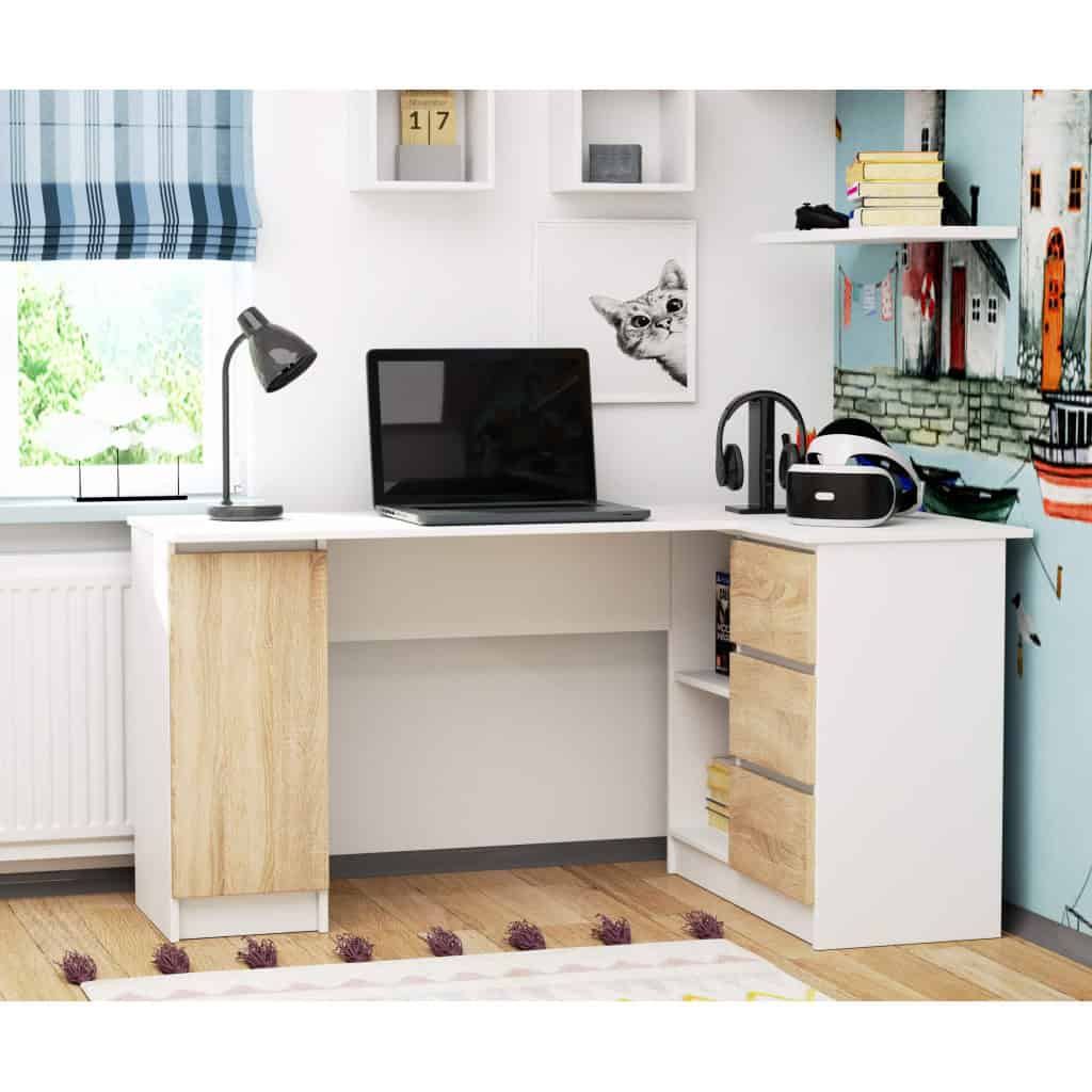 Birou colt dreapta in L cu 3 sertare si rafturi, PAL laminat 16 mm, 155x85x77 cm, alb si stejar sonoma Mob360