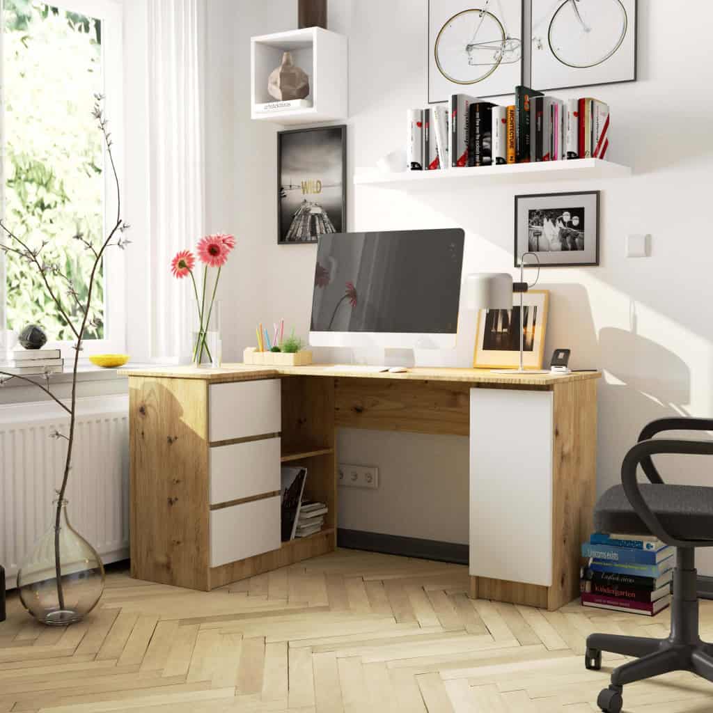 Birou colt stanga in L cu 3 sertare si rafturi, PAL laminat 16 mm, 155x85x77 cm, stejar artisan si alb Mob360 – produs disponibil în magazinul Mob360.