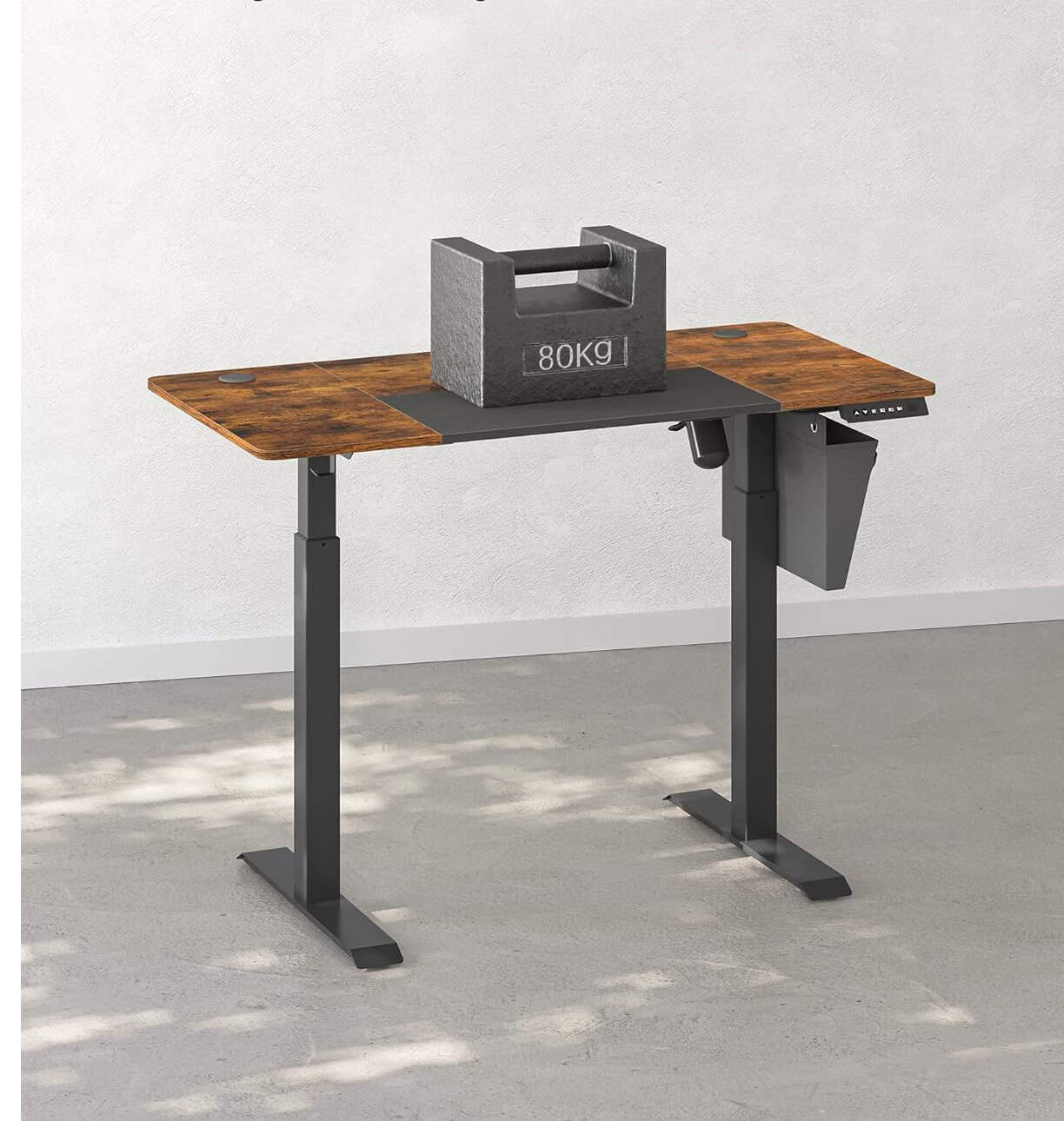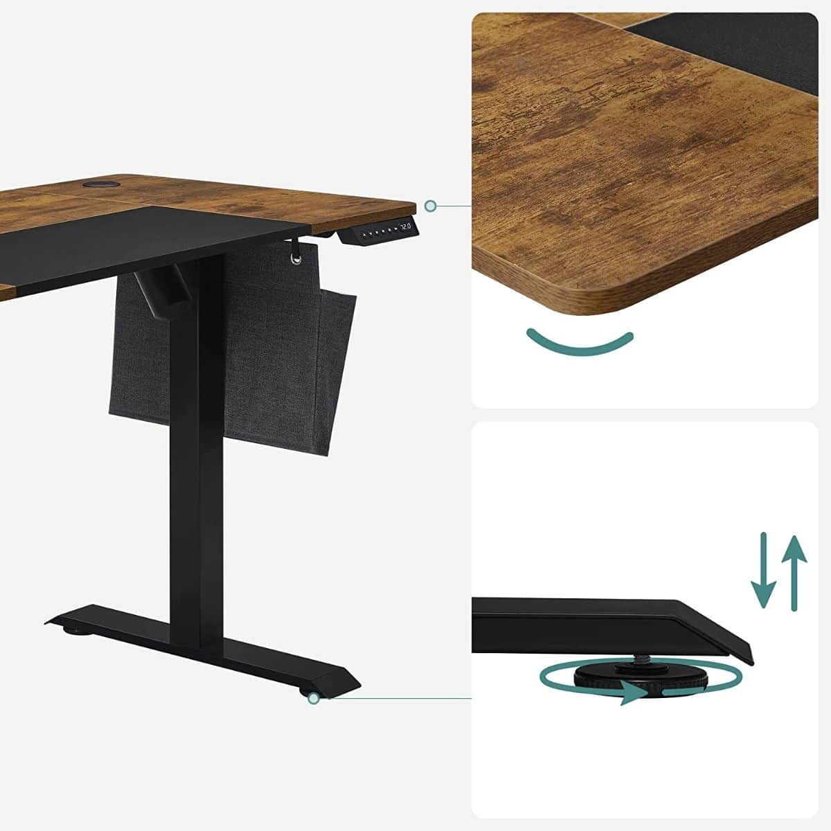 Detalii produs: Culoare: Vintage maro-negru Material: Placi aglomerate din lemn, otel, tesatura netesuta Dimensiuni: 120 x 60 x (72-120) cm. Grosimea blatului mesei: 1,5 cm. Greutate: 25,5 kg. Max. Capacitate de incarcare: 80 kg Despre acest articol Puteti regla inaltimea biroului electric intre 72 si 120 cm si puteti stoca 4 inaltimi preferate. Exista, de asemenea, un sistem de protectie la clatinare.Buzunar textil pe partea stanga sau dreapta pentru carti, reviste si multe altele, 3 carlige pentru casti si genti, 2 prize pentru o buna gestionare a cablurilor.Placa imbinata in maro vintage si negru de baza confera acestui suport de birou mai mult stil, iar textura asemanatoare tesaturii din zona neagra de baza a blatului ofera o senzatie de confort.Piesele marcate si instructiunile ilustrate usor de urmat asigura o asamblare fara efort. Astfel, puteti gasi un stil de lucru flexibil in cel mai scurt timp!Acest birou electric cu cadru solid din otel care poate sustine pana la 80 kg; un blat de masa linistit cu un zgomot de functionare mai mic de 50 dB.