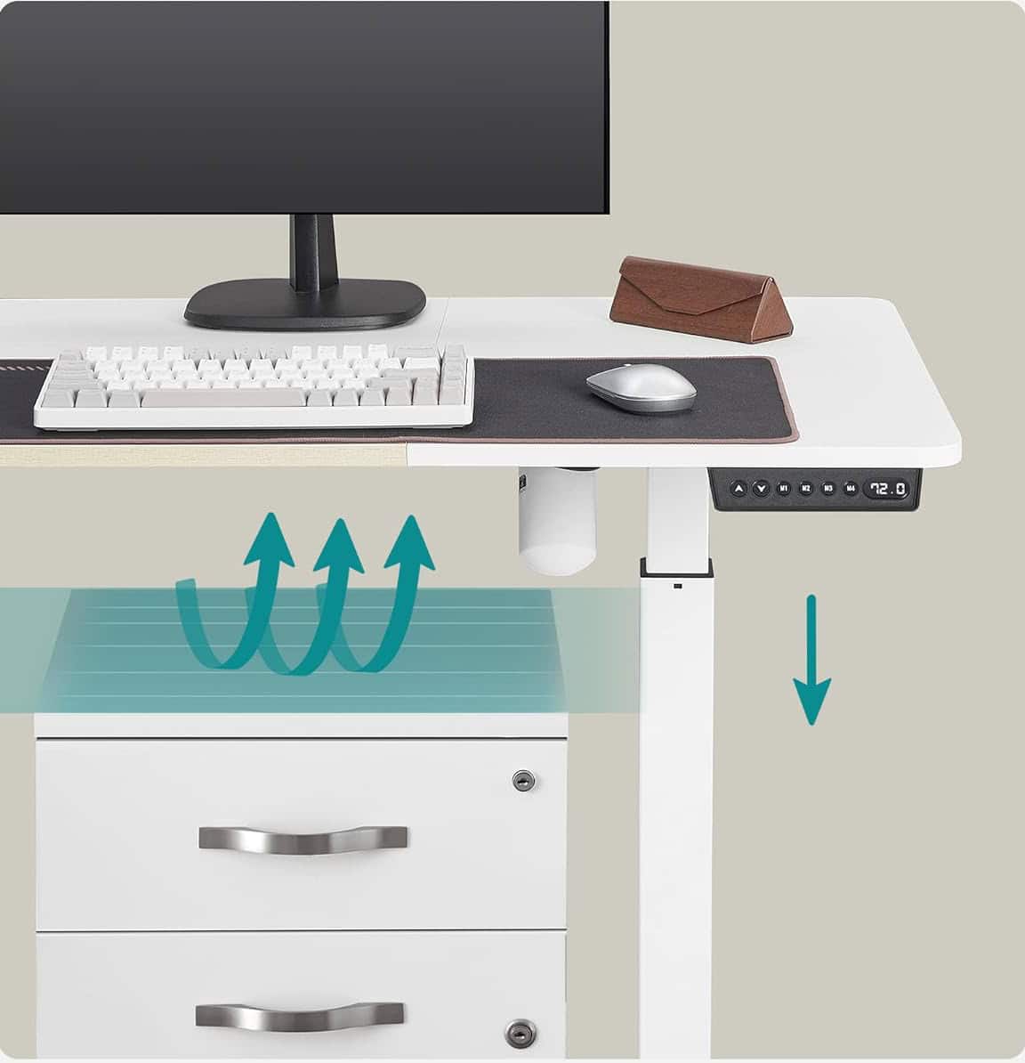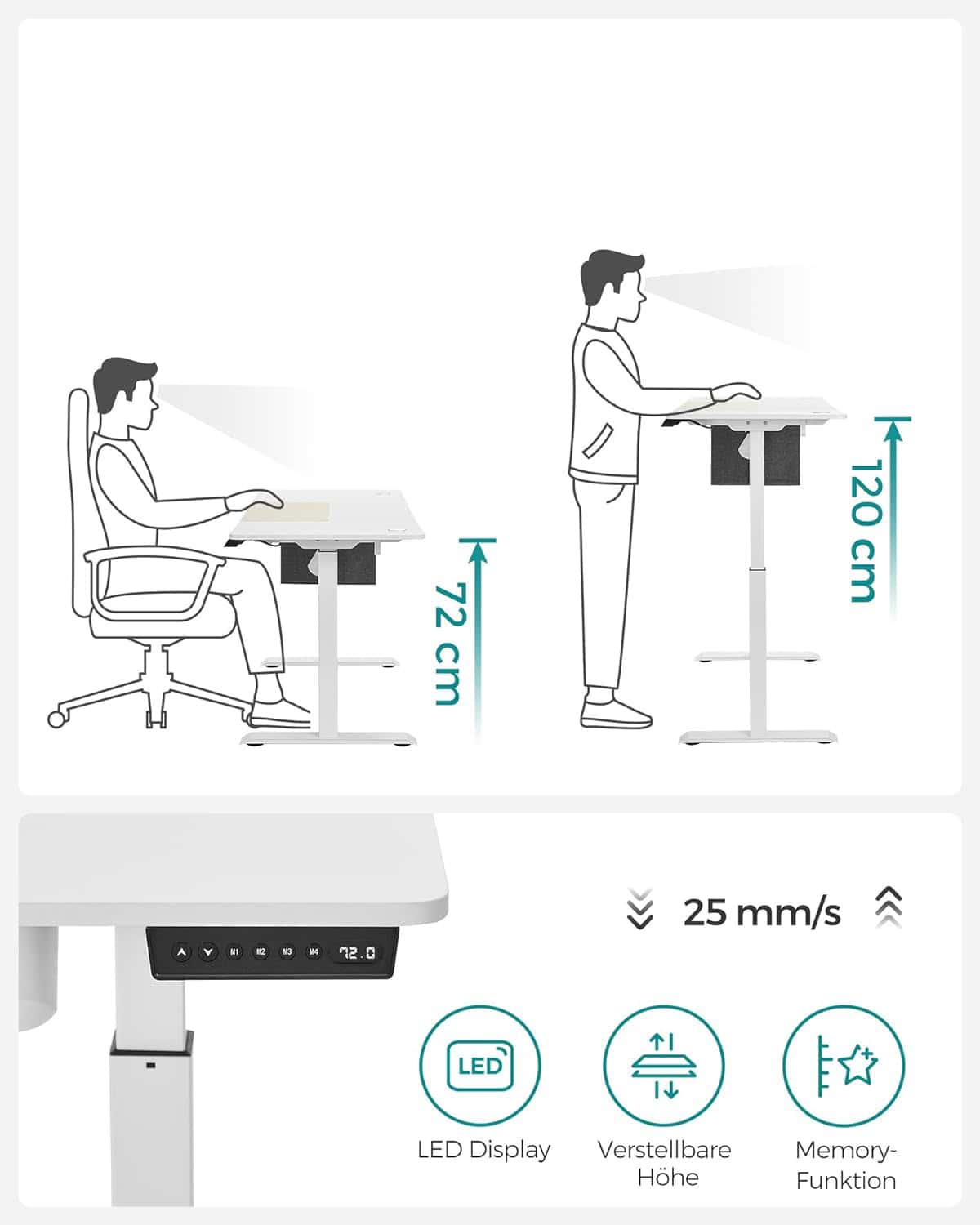 Puteti regla inaltimea biroului electric intre 72 si 120 cm si puteti stoca 4 inaltimi preferate.