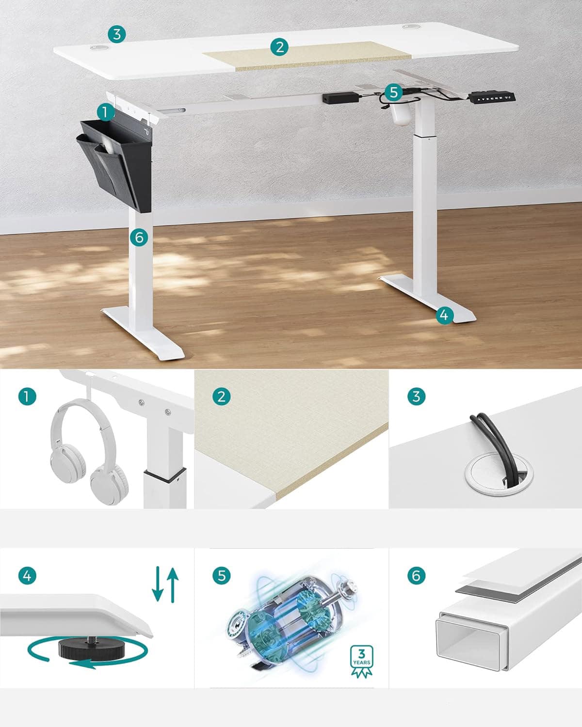 Piesele marcate si instructiunile ilustrate usor de urmat asigura o asamblare fara efort. Acest birou electric cu cadru robust din otel poate sustine pana la 80 kg.