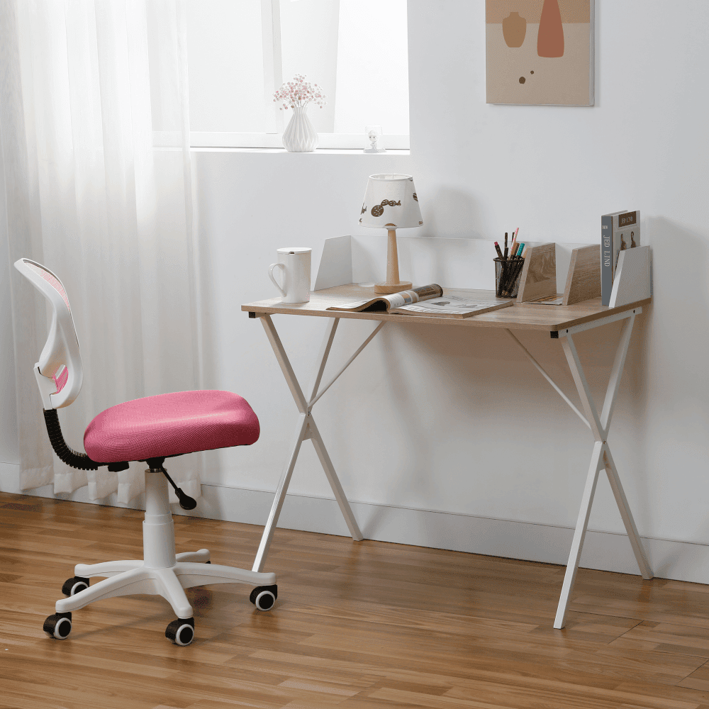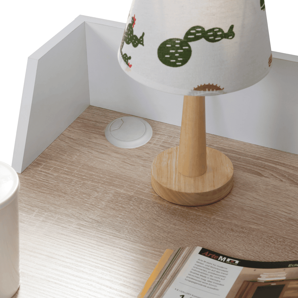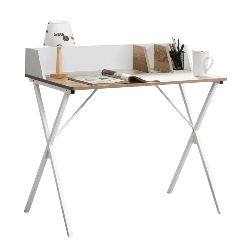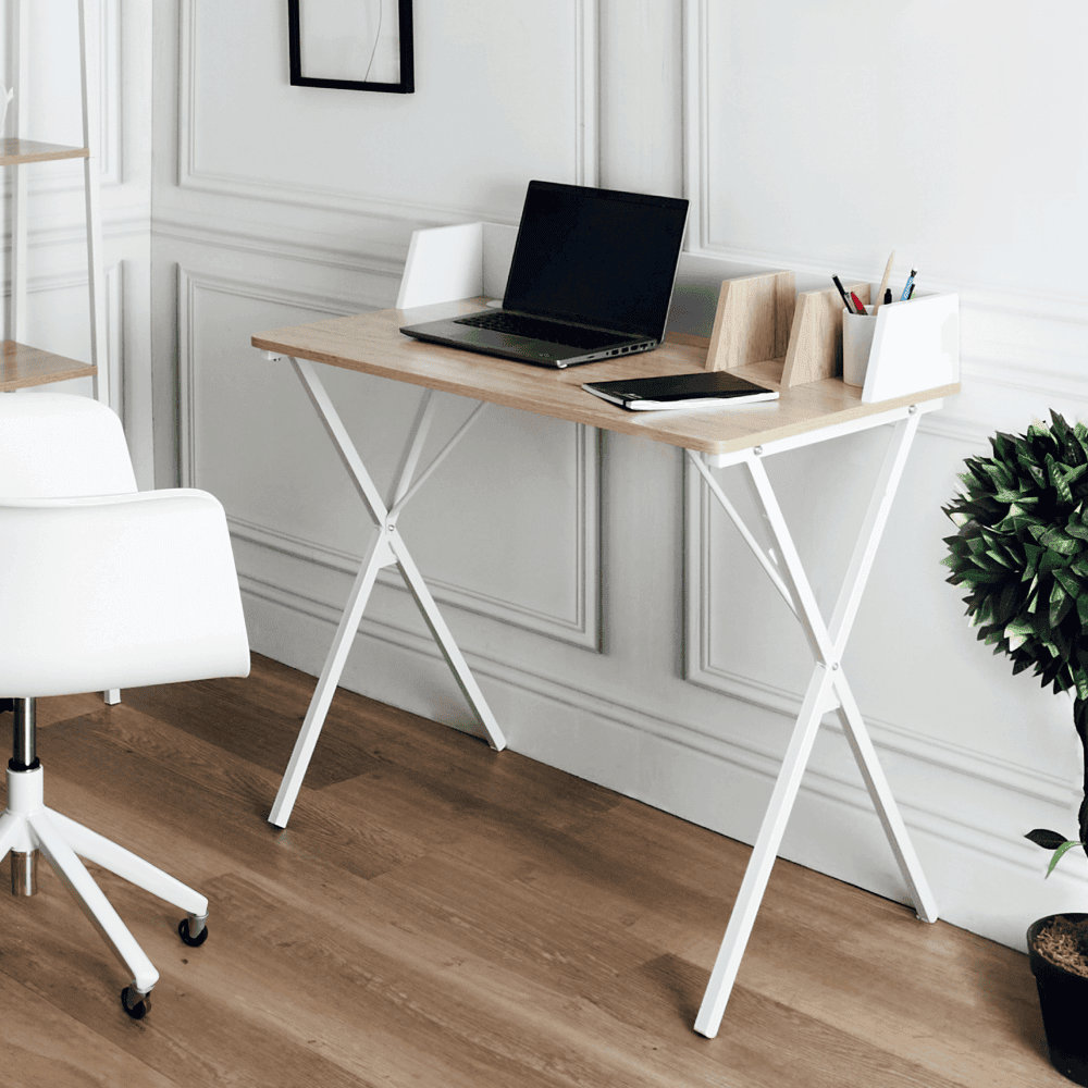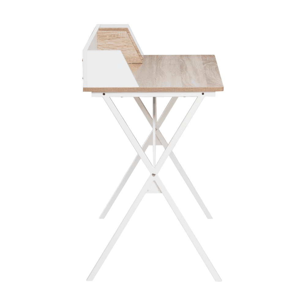 Materialul plăcii: DTD laminat/metal Culoare: stejar deschis/alb Dimensiuni (Lxlxh): 90x50x85 cm Grosime material: 1,5 cm Portanţă: 40 kg Secţiune din spate înălţată Orificiu pentru cablu Diametrul orificiului pentru cablu: 5 cm Organizator de birou Design modern Birou multifuncţional Utilizare universală Birou de lucru/scriere Livrat dezasamblat