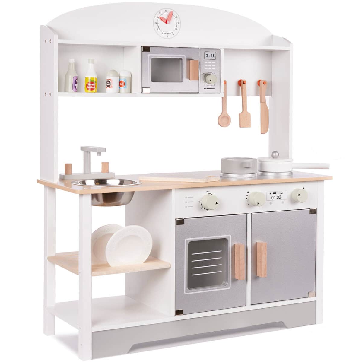 Bucatarie din lemn pentru copii cu accesorii, MDF si lemn, 68x25x82 cm, gri si alb Mob360
