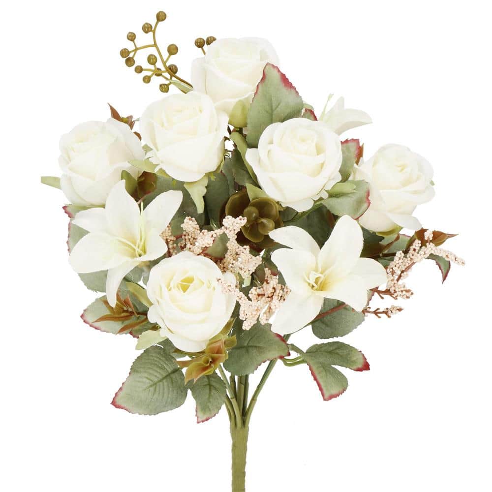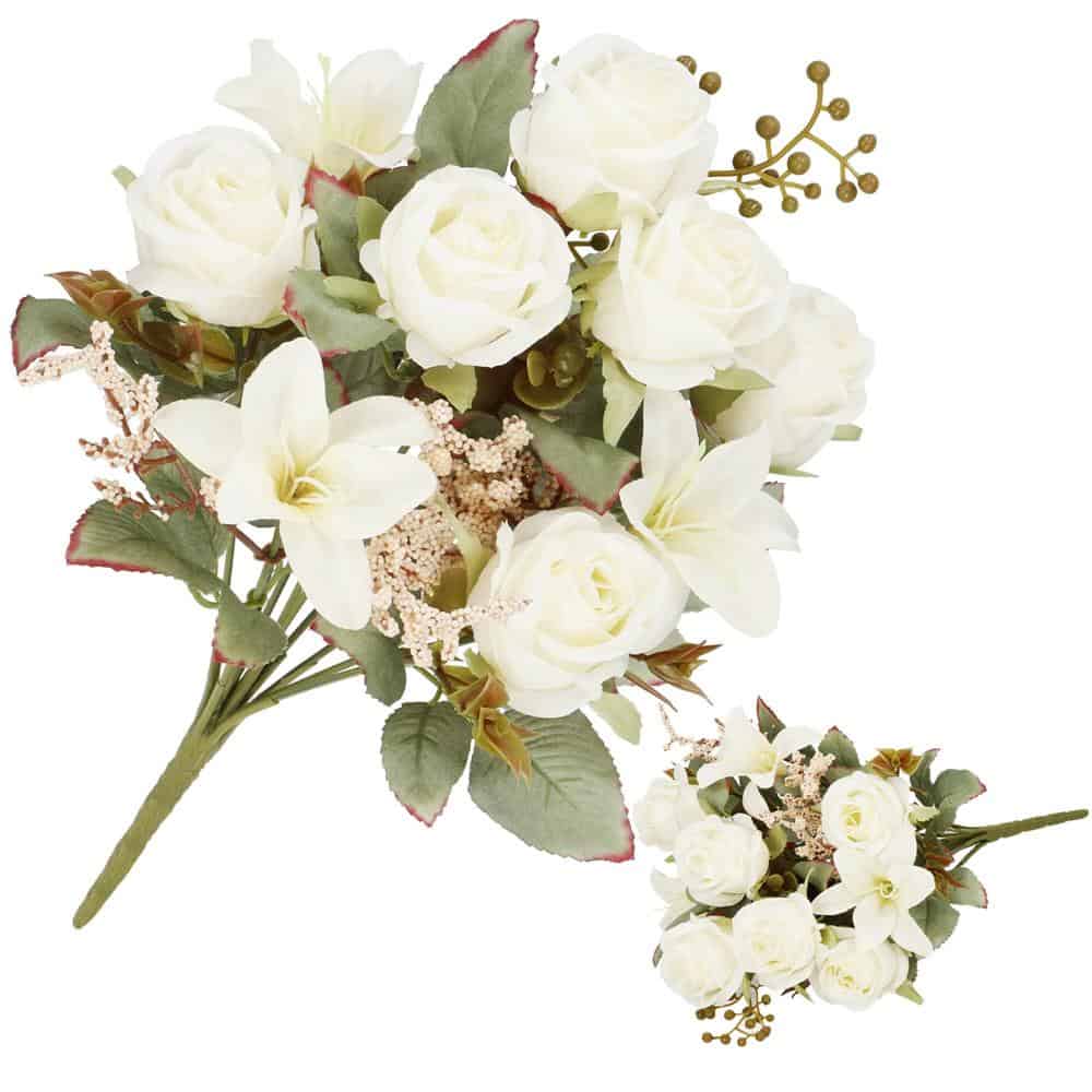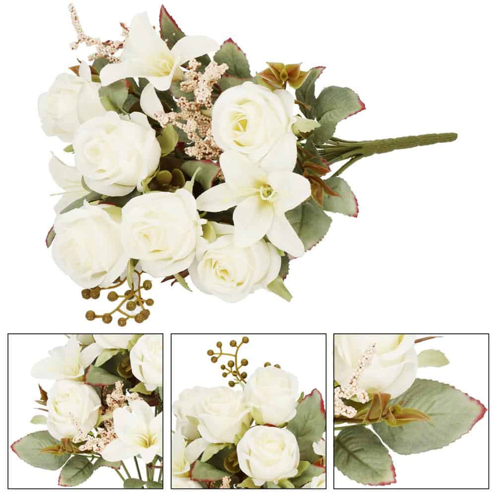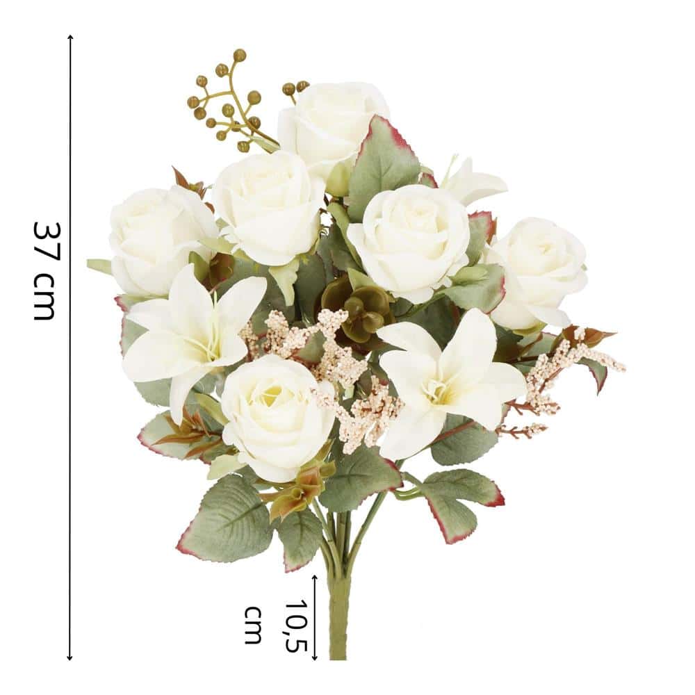 Buchet de flori artificiale din poliester, 9 fire trandafiri si crini, 37cm, alb Mob360