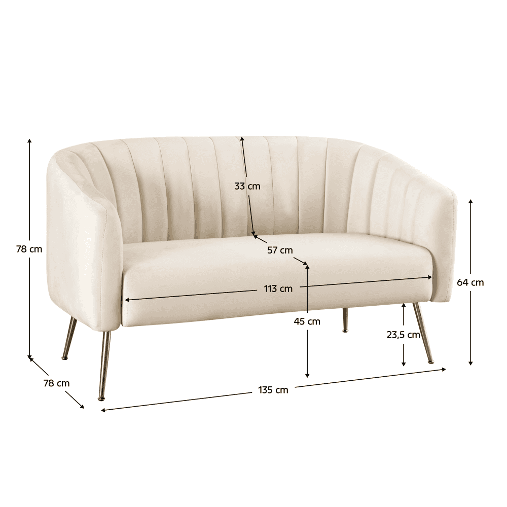 Material: ţesătură velvet/metal Rezistenţa ţesăturii la frecare conform testului Martindale: 95 000 de cicluri de frecare Culoare: bej/gold crom-auriu Dimensiuni (lxAxh): 135x78x78 cm Înălţimea părţii de şezut: 45 cm Adâncimea părţii de şezut: 57 cm Lăţimea părţii de şezut: 113 cm Înălţime spătar: 33 cm Înălţimea cotierei de la sol: 64 cm Înălţimea compartimentului inferior de la podea: 23,5 cm Portanţă pe persoană: 90 kg Umplutură: spumă Complet tapiţat De lux Decorativ matlasate Pe picioare Livrat dezasamblat