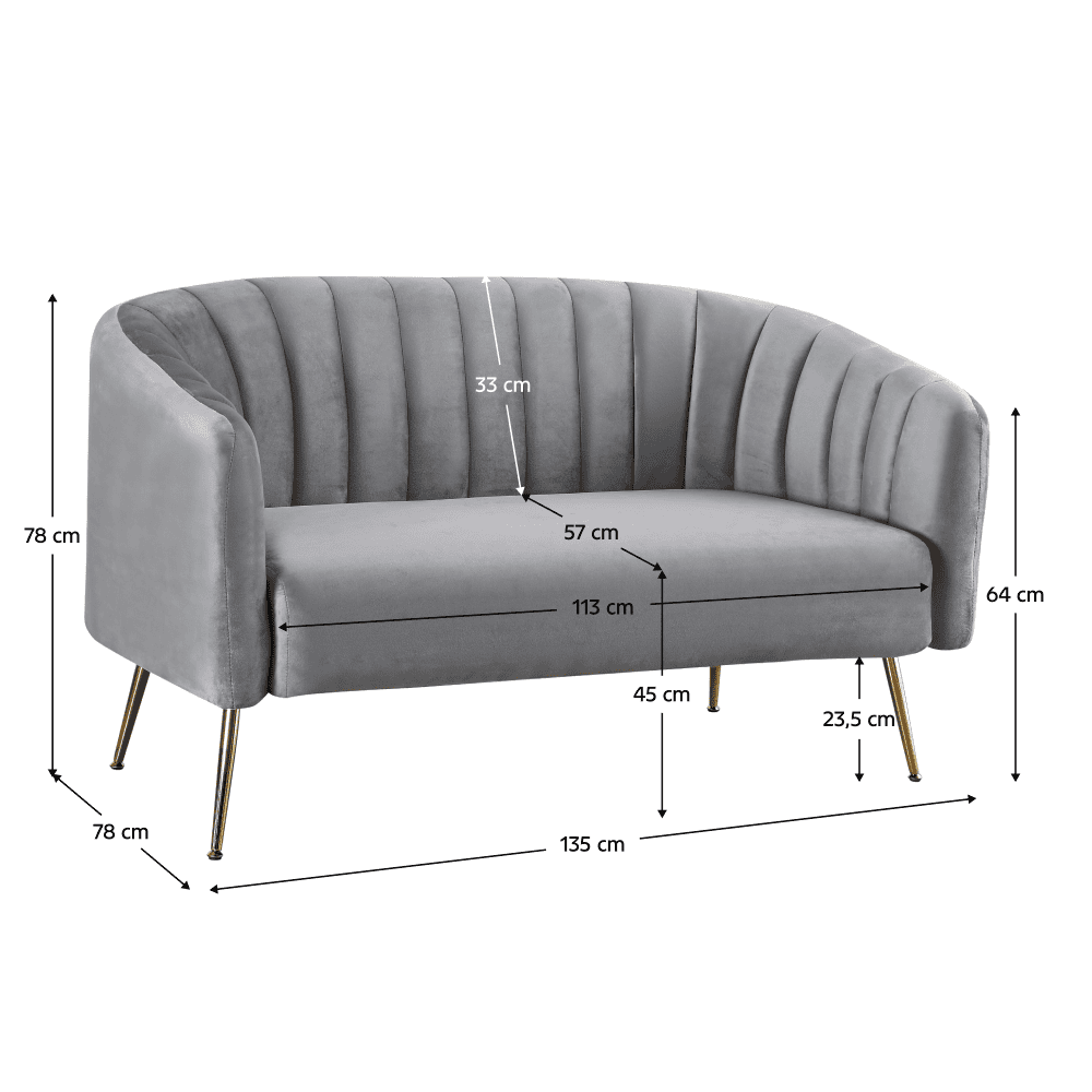 Material: ţesătură velvet/metal Rezistenţa ţesăturii la frecare conform testului Martindale: 95 000 de cicluri de frecare Culoare: gri/gold crom-auriu Dimensiuni (lxAxh): 135x78x78 cm Înălţimea părţii de şezut: 45 cm Adâncimea părţii de şezut: 57 cm Lăţimea părţii de şezut: 113 cm Înălţime spătar: 33 cm Înălţimea cotierei de la sol: 64 cm Înălţimea compartimentului inferior de la podea: 23,5 cm Portanţă pe persoană: 90 kg Umplutură: spumă Complet tapiţat De lux Decorativ matlasate Pe picioare Livrat dezasamblat