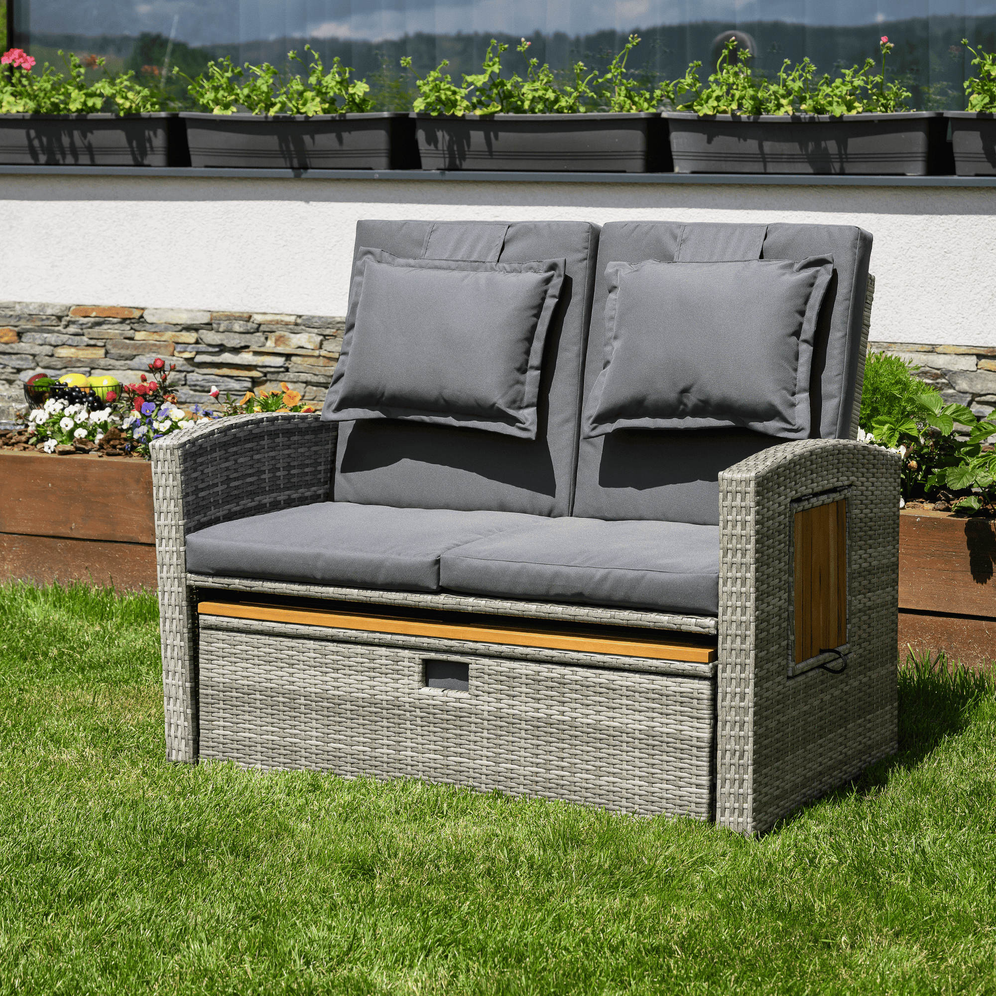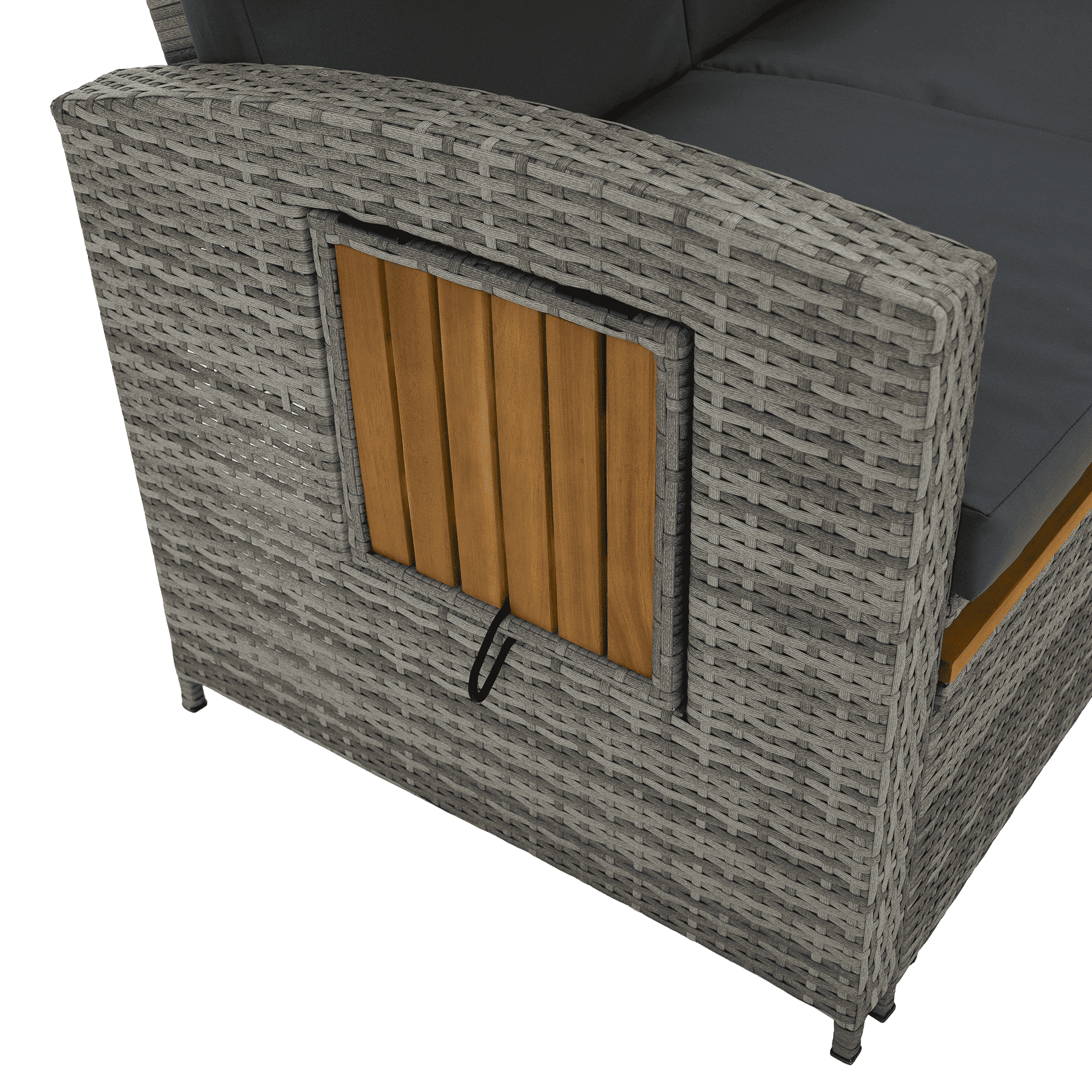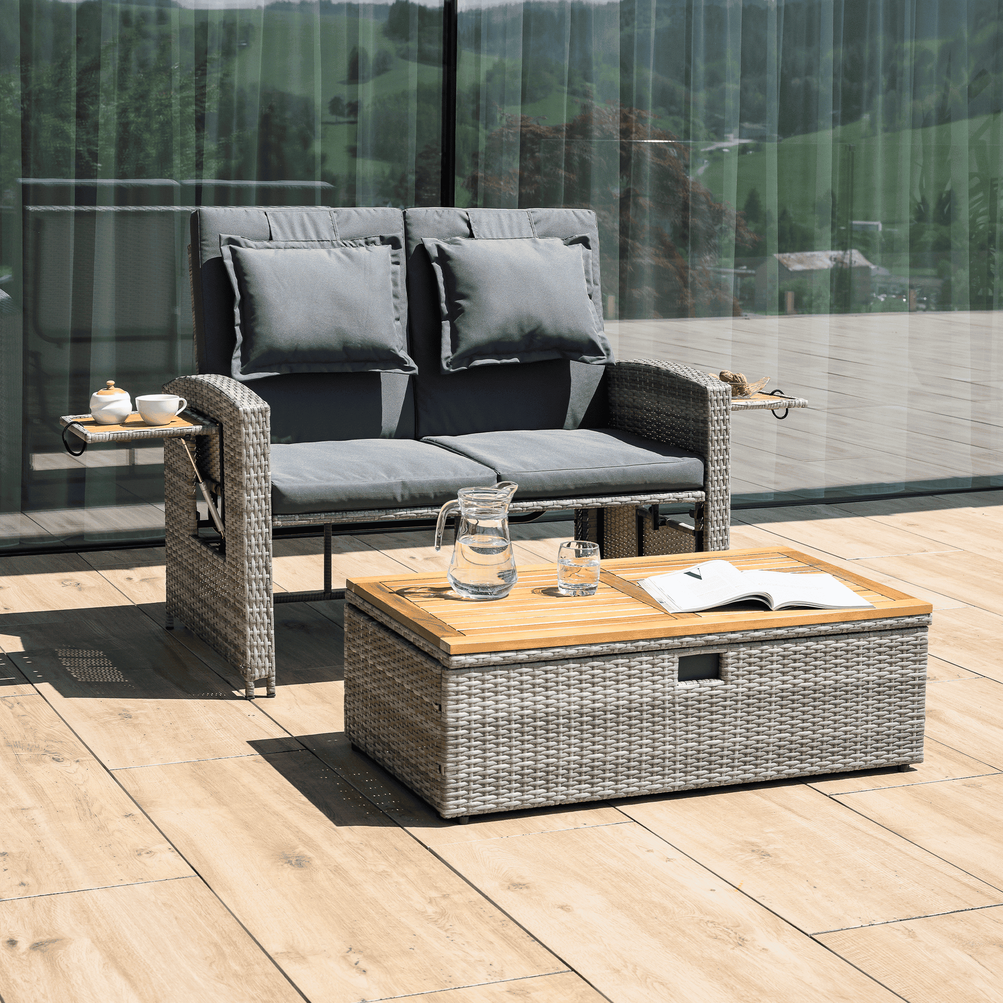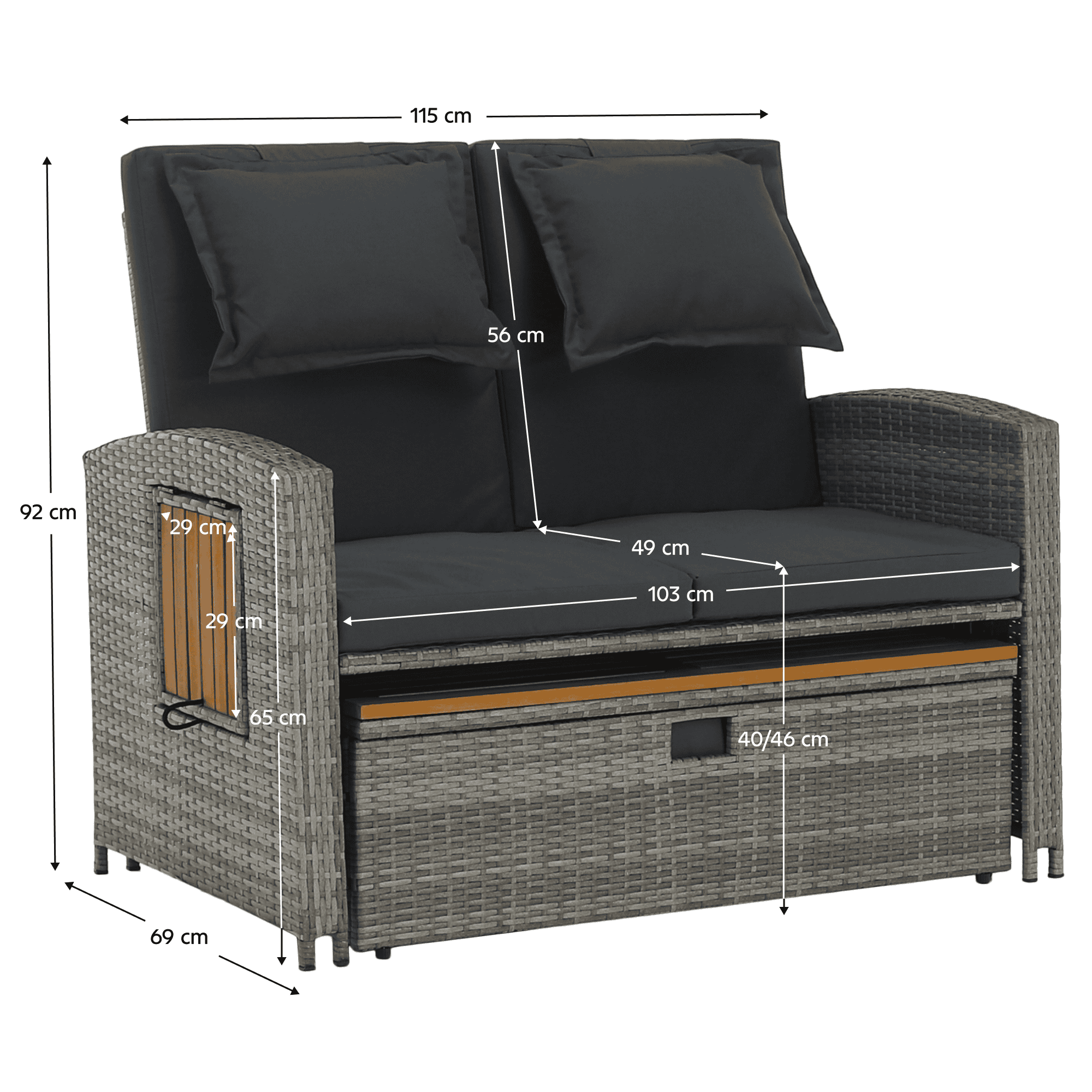Material: ratan tehnic/oţel/ţesătură/lemn de salcâm Rezistenţa ţesăturii la frecare conform testului Martindale: 95 000 cicluri de frecare Culoare: gri/naturală Dimensiuni canapea (lxAxh): 115/173x69x92 cm Înălţimea părţii de şezut fără pernă: 40 cm Înălţimea părţii de şezut cu pernă: 46 cm Adâncimea părţii de şezut: 49 cm Lăţimea părţii de şezut: 103 cm Dimensiuni bancă (lxAxh): 99×55,5×33 cm Înălţimea părţii de şezut fără pernă: 33 cm Înălţimea părţii de şezut cu pernă: 45 cm Dimensiunile măsuţei pliabile (lxA): 29×29 cm Lăţime spate: 103 cm Dimensiuni de dispunere (lxL): 103×165 cm Înălţime cotieră: 65 cm Portanţă: 130 kg Greutate: 32 kg Set din 2 piese Canapea Bancă 2x măsuţe auxiliare batante Spătar reglabil 4 poziţii de înclinare a spătarului Cu cotiere Livrat cu perne Husă detaşabilă şi impermeabilă Husele pot fi spălate la temperatura de 30°C Nu uscaţi husele în uscător, nu folosiţi înălbitor, nu curăţaţi chimic şi nu călcaţi Deschiderea capacului băncii cu piston hidraulic Potrivit pentru unelte de grădină, jucării, perne, pături, banca se poate împingere sub canapea Utilizare versatilă Design modern Design natural Potrivită pentru utilizare în exterior Rezistent la intemperii Vă recomandăm să protejaţi produsul de intemperii pentru a prelungi durata de viaţă a produsului Livrat dezasamblat