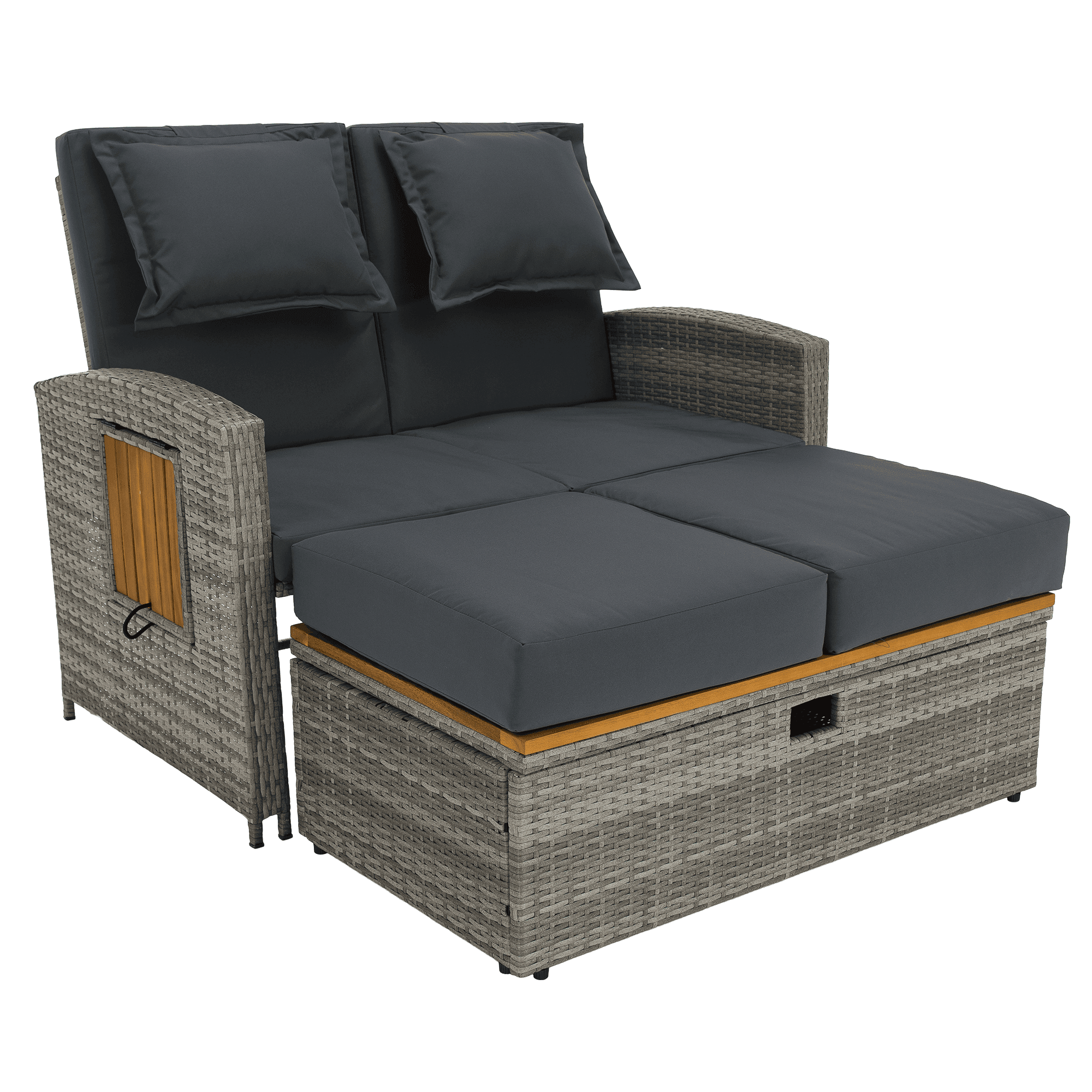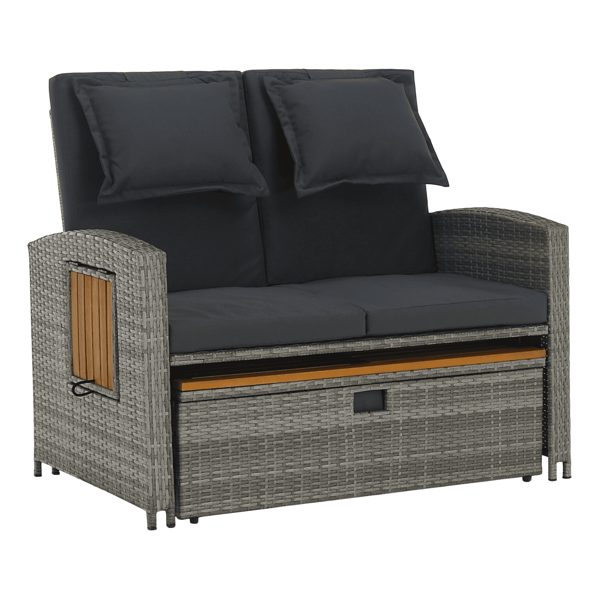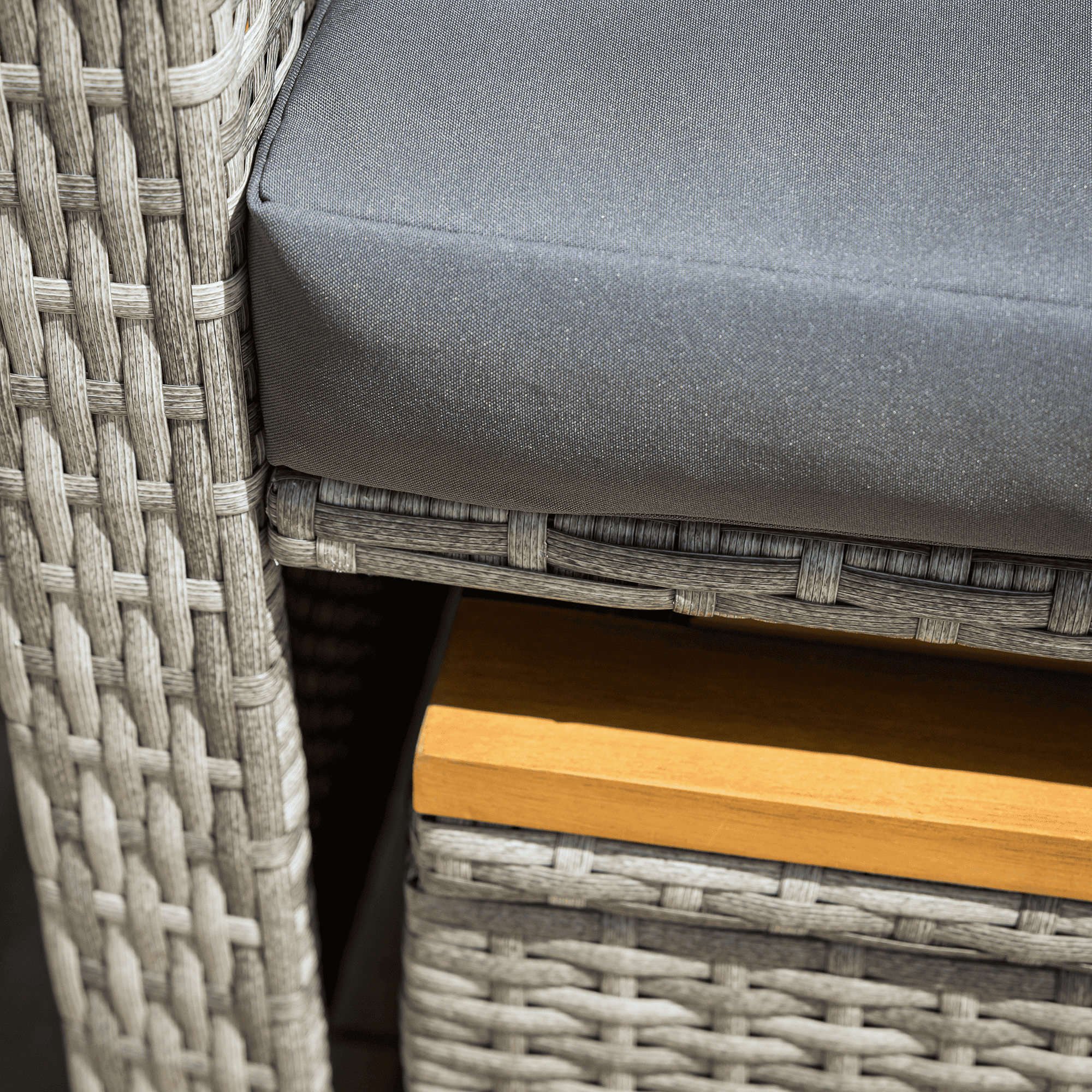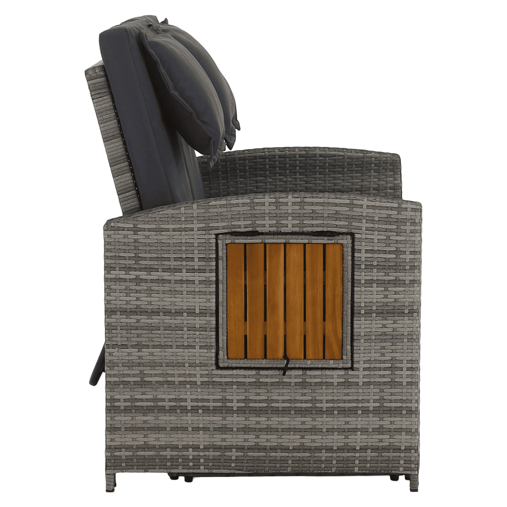 Material: ratan tehnic/oţel/ţesătură/lemn de salcâm Rezistenţa ţesăturii la frecare conform testului Martindale: 95 000 cicluri de frecare Culoare: gri/naturală Dimensiuni canapea (lxAxh): 115/173x69x92 cm Înălţimea părţii de şezut fără pernă: 40 cm Înălţimea părţii de şezut cu pernă: 46 cm Adâncimea părţii de şezut: 49 cm Lăţimea părţii de şezut: 103 cm Dimensiuni bancă (lxAxh): 99×55,5×33 cm Înălţimea părţii de şezut fără pernă: 33 cm Înălţimea părţii de şezut cu pernă: 45 cm Dimensiunile măsuţei pliabile (lxA): 29×29 cm Lăţime spate: 103 cm Dimensiuni de dispunere (lxL): 103×165 cm Înălţime cotieră: 65 cm Portanţă: 130 kg Greutate: 32 kg Set din 2 piese Canapea Bancă 2x măsuţe auxiliare batante Spătar reglabil 4 poziţii de înclinare a spătarului Cu cotiere Livrat cu perne Husă detaşabilă şi impermeabilă Husele pot fi spălate la temperatura de 30°C Nu uscaţi husele în uscător, nu folosiţi înălbitor, nu curăţaţi chimic şi nu călcaţi Deschiderea capacului băncii cu piston hidraulic Potrivit pentru unelte de grădină, jucării, perne, pături, banca se poate împingere sub canapea Utilizare versatilă Design modern Design natural Potrivită pentru utilizare în exterior Rezistent la intemperii Vă recomandăm să protejaţi produsul de intemperii pentru a prelungi durata de viaţă a produsului Livrat dezasamblat