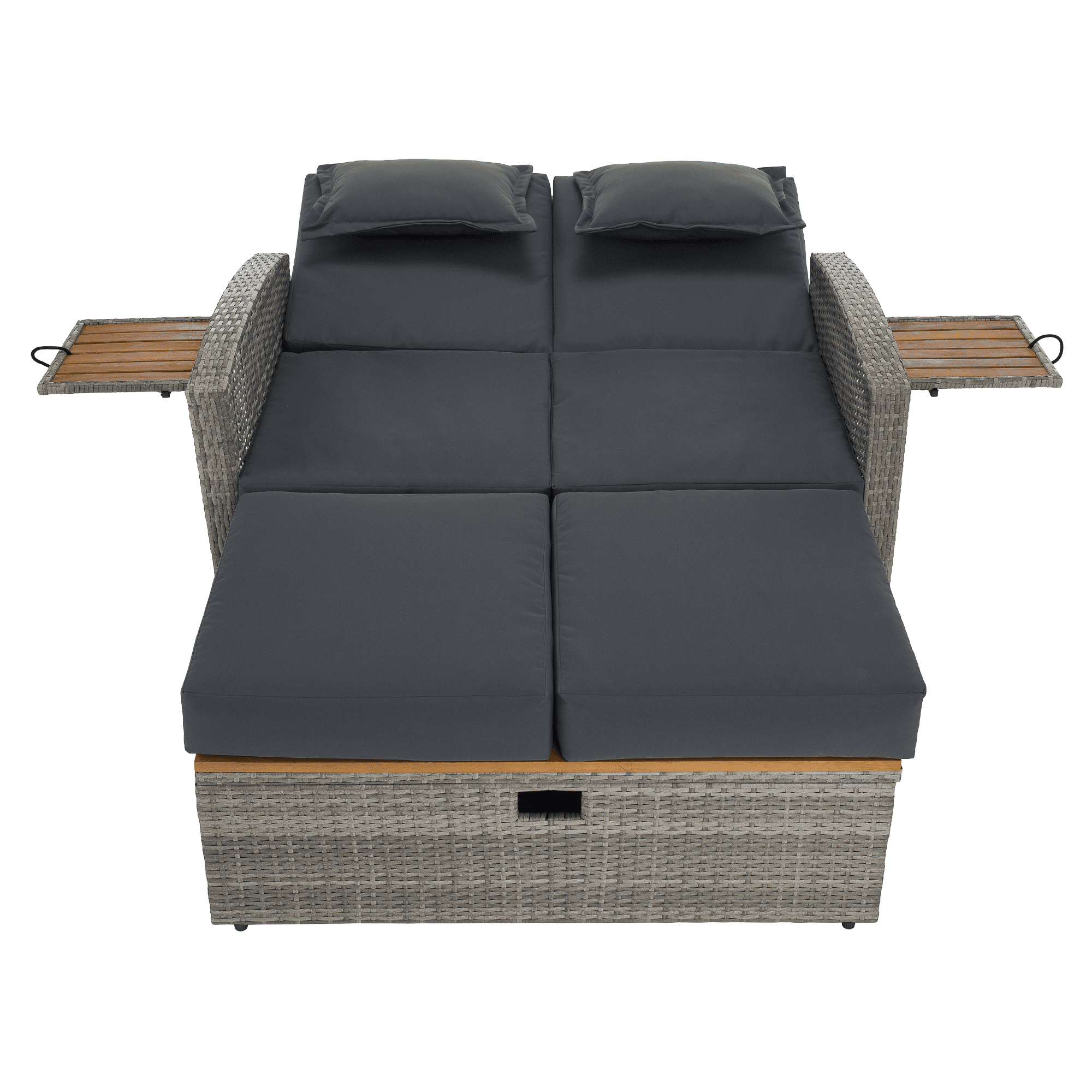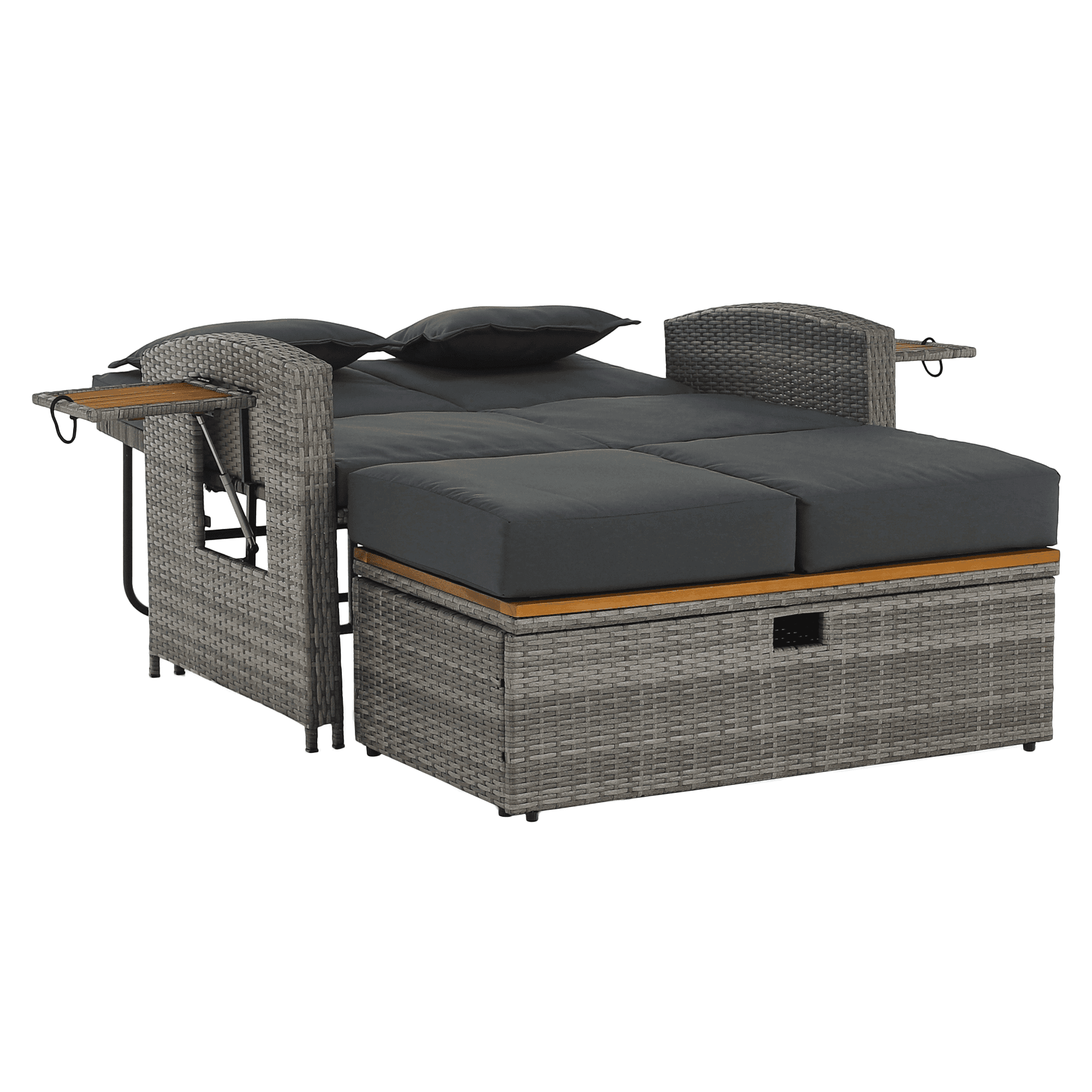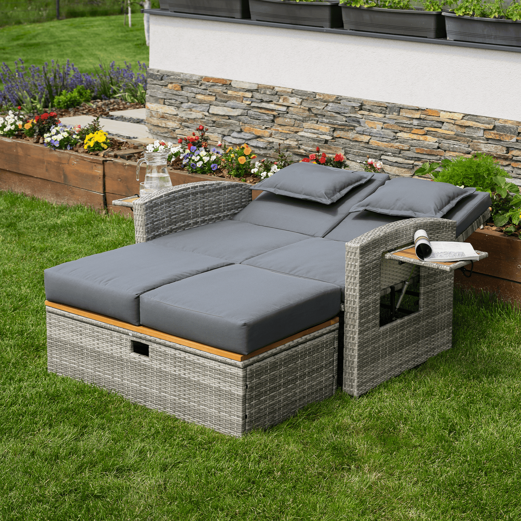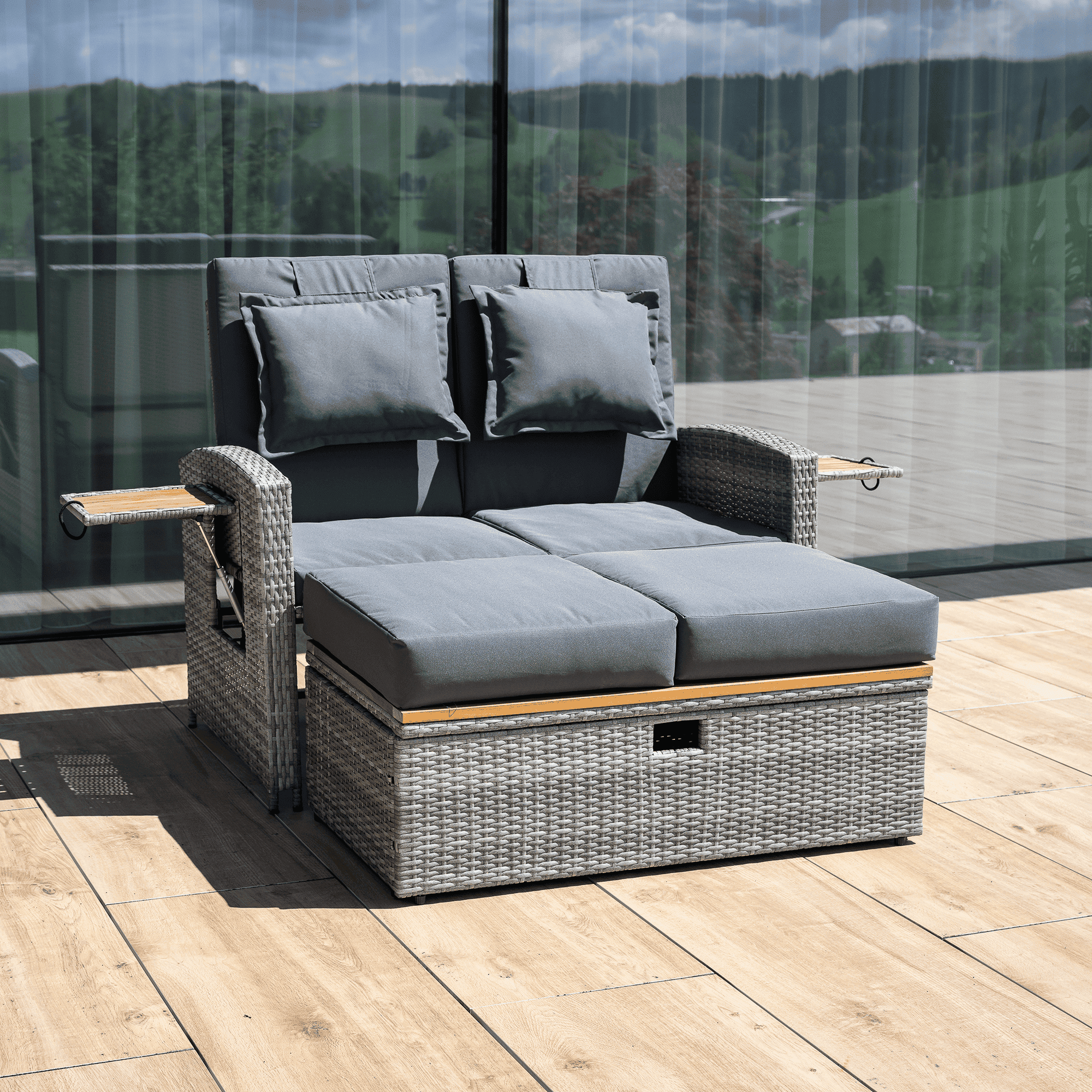 Material: ratan tehnic/oţel/ţesătură/lemn de salcâm Rezistenţa ţesăturii la frecare conform testului Martindale: 95 000 cicluri de frecare Culoare: gri/naturală Dimensiuni canapea (lxAxh): 115/173x69x92 cm Înălţimea părţii de şezut fără pernă: 40 cm Înălţimea părţii de şezut cu pernă: 46 cm Adâncimea părţii de şezut: 49 cm Lăţimea părţii de şezut: 103 cm Dimensiuni bancă (lxAxh): 99×55,5×33 cm Înălţimea părţii de şezut fără pernă: 33 cm Înălţimea părţii de şezut cu pernă: 45 cm Dimensiunile măsuţei pliabile (lxA): 29×29 cm Lăţime spate: 103 cm Dimensiuni de dispunere (lxL): 103×165 cm Înălţime cotieră: 65 cm Portanţă: 130 kg Greutate: 32 kg Set din 2 piese Canapea Bancă 2x măsuţe auxiliare batante Spătar reglabil 4 poziţii de înclinare a spătarului Cu cotiere Livrat cu perne Husă detaşabilă şi impermeabilă Husele pot fi spălate la temperatura de 30°C Nu uscaţi husele în uscător, nu folosiţi înălbitor, nu curăţaţi chimic şi nu călcaţi Deschiderea capacului băncii cu piston hidraulic Potrivit pentru unelte de grădină, jucării, perne, pături, banca se poate împingere sub canapea Utilizare versatilă Design modern Design natural Potrivită pentru utilizare în exterior Rezistent la intemperii Vă recomandăm să protejaţi produsul de intemperii pentru a prelungi durata de viaţă a produsului Livrat dezasamblat