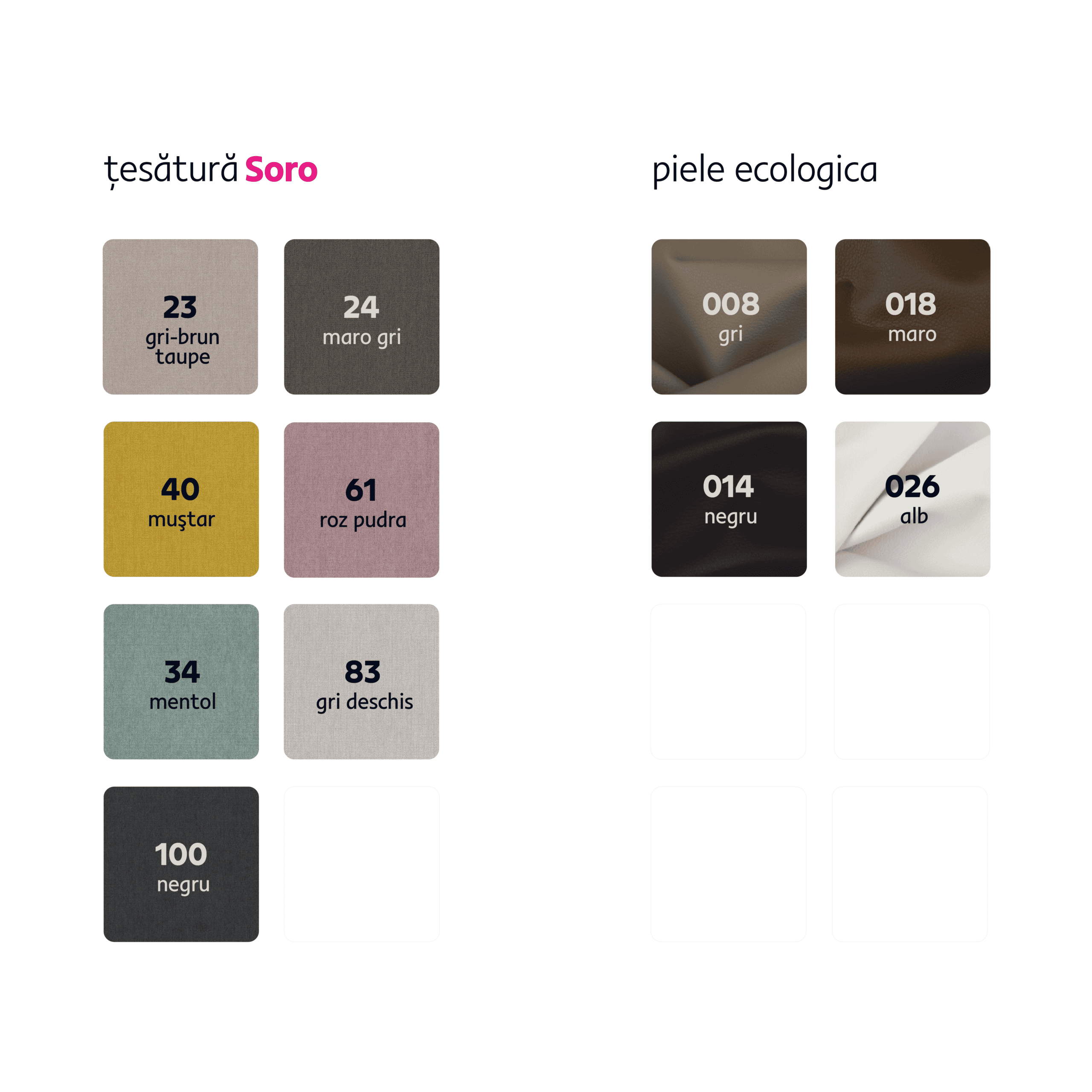 Variantă pentru partea dreaptă Umplutură: arcuri ondulate + spumă poliuretanică Livrat dezasamblat Posibilitate de a comanda in 4 nuanţe de culoare ale pielii ecologice si 7 nuanţe de culoare ale materialului Soro la preţul de 6 639,-. La plasarea comenzii, specificaţi direct în notiţe nuanţa de culoare aleasă. La o comandă individuală, este necesară o plată în avans de 20% din suma respectivă. După achitarea avansului, comanda dumneavoastră va intra în producţie. Termenul de livrare 6-8 săptămâni.