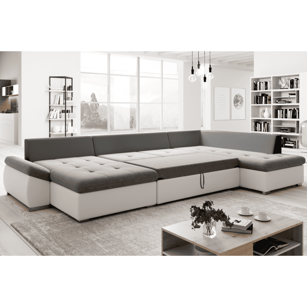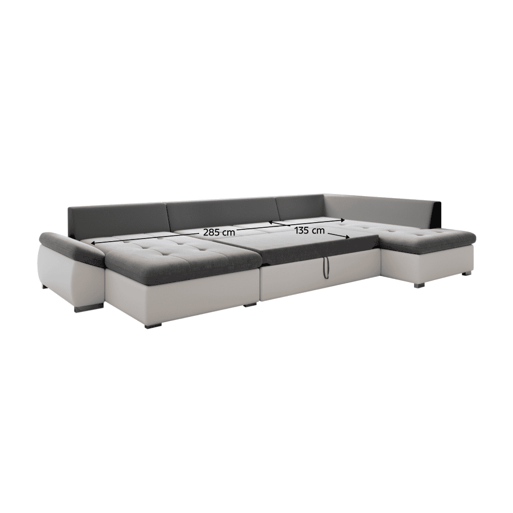 Material: piele ecologică / ţesătură Soro 93 Rezistenţa ţesăturii conform testului Martindale: 90.000 de cicluri de frecare Rezistenţa pielii ecologice conform testului Martindale: 100.000 de cicluri de frecare Culoare: albă/gri Dimensiuni (LxAxÎ): 355×205/162×65/76 cm Suprafaţa pentru dormit (LxL): 135×285 cm Înălţime scaun: 41 cm Adâncime scaun: 48/63 cm Lăţime otoman: 96 cm