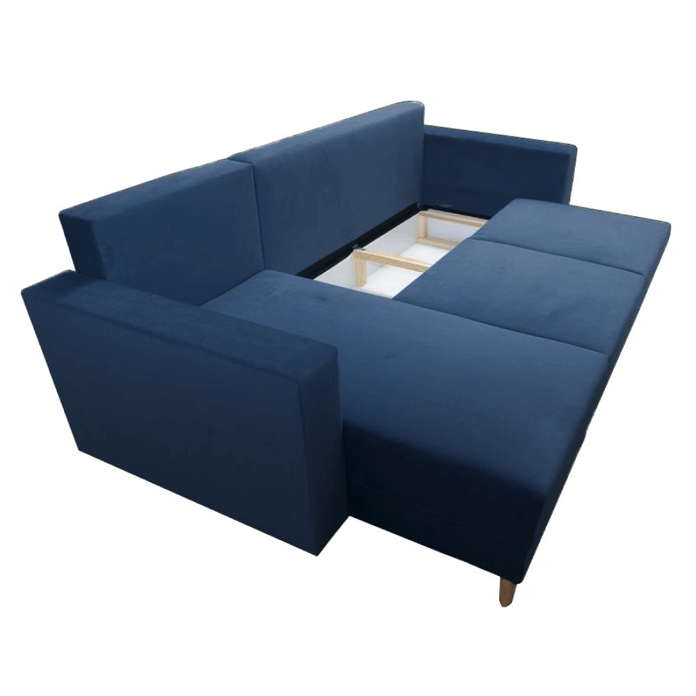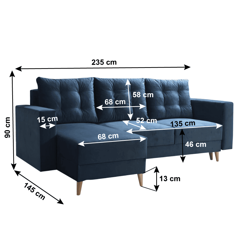 Material tapiţerie: ţesătură Kronos 9 Rezistenţa la frecare a ţesăturii conform testului Martindale: 50.000 Culoare tapiţerie: albastră Dimensiuni (LxAxÎ): 235x145x90 cm Suprafaţa pentru dormit (LxL): 130×200 cm Înălţime scaun: 46 cm Adâncime scaun: 52 cm Lăţime otoman: 68 cm Lăţime scaun: 135 cm Lăţime cotieră: 15 cm Înălţimea compartimentului inferior de la podea: 13 cm Cu picioare de lemn Culoare picioare: fag Capacitate de susţinere per persoană: 90 kg Umplutura: arcuri ondulate + spumă poliuretanică, 3 perne incluse în set, Dimensiuni perne (LxL): 68×58 cm Colţar extensibil, Tapiţat integral, Cu spaţiu de depozitare, Stânga, Livrat dezasamblat
