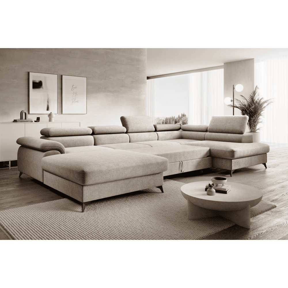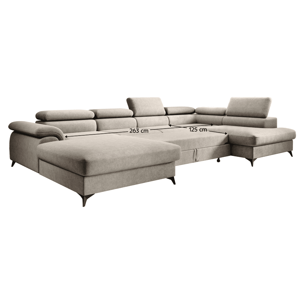 Material: ţesătură Whisper 02 Rezistenţa ţesăturii conform testului Martindale: 100.000 de cicluri de frecare Culoare: bej Dimensiuni (LxAxÎ): 350x205x75/95 cm Suprafaţa pentru dormit (LxL): 125×263 cm Înălţime scaun: 43 cm Adâncime scaun: 58 cm Lăţimea dintre otomane: 130 cm Adâncimea otomanului mai mic: 110 cm