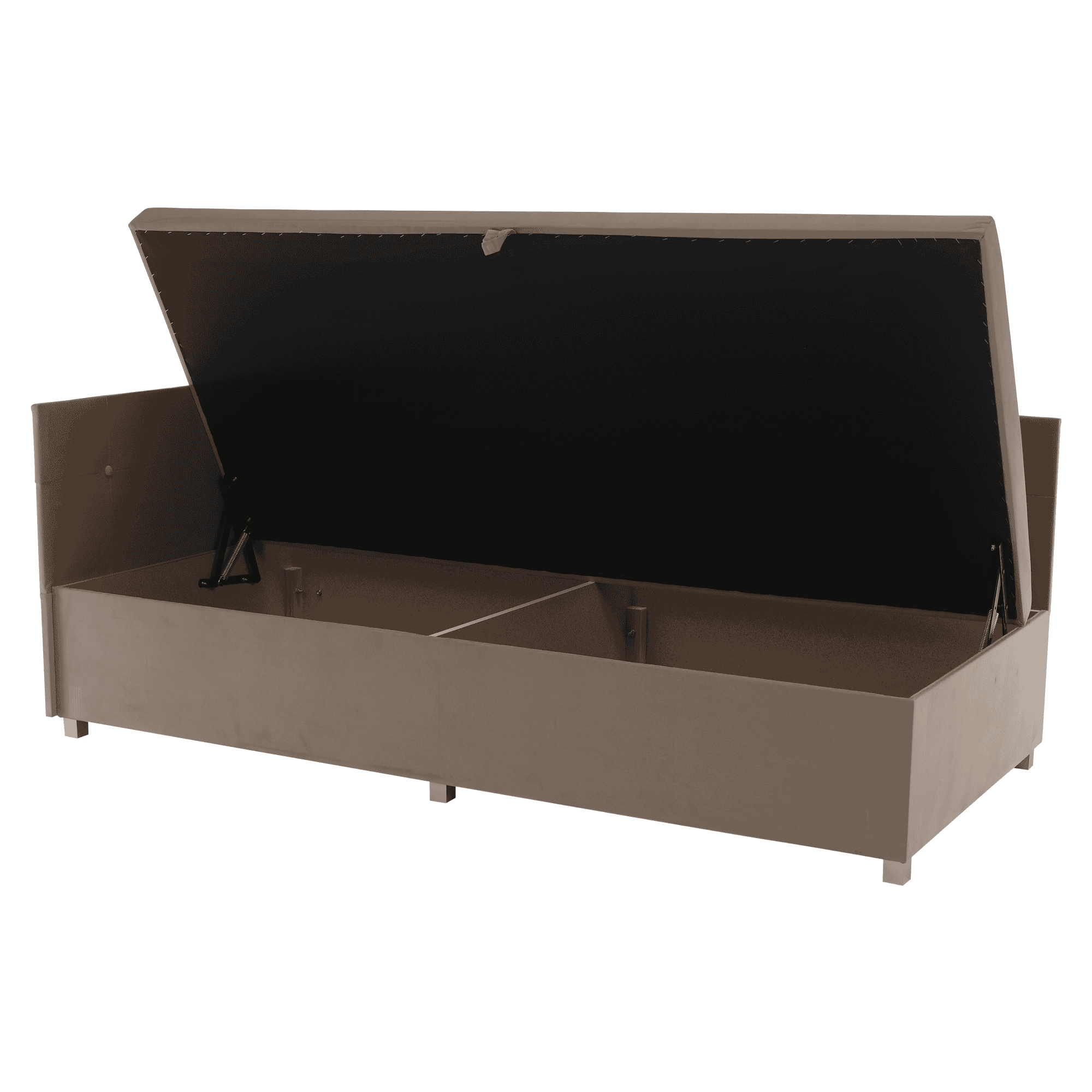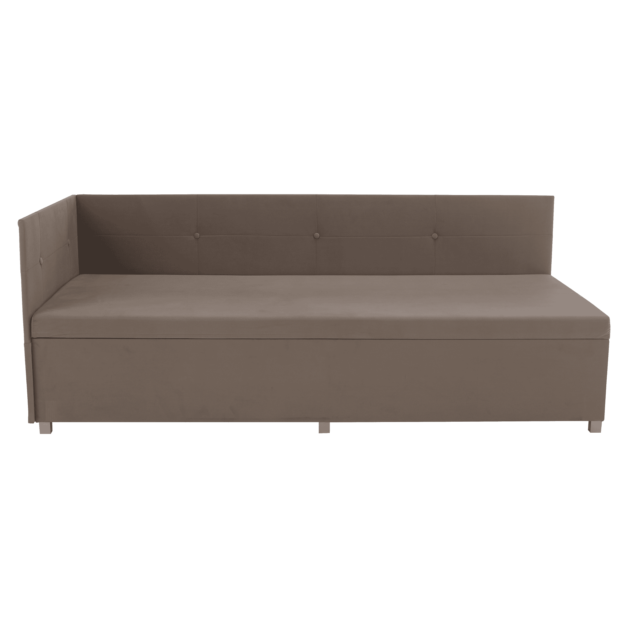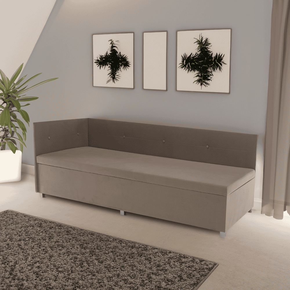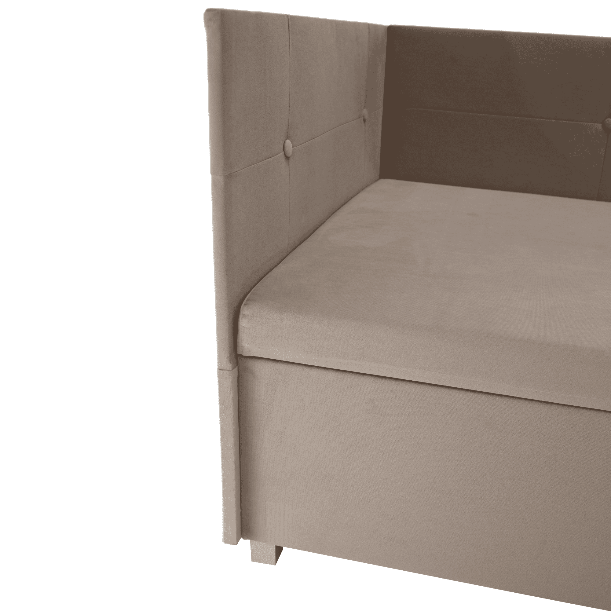 Material: Material: ţesătură Trinity 03 Rezistenţa ţesăturii la frecare conform testului Martindale: 210 000 de cicluri de frecare Miezul canapelei: spumă pur T28 Culoare: bej-gri Dimensiuni (Lxlxh): 93x204x75 cm Suprafaţa pentru dormit (Lxl): 90×200 cm Înălţime de la sol la saltea: 42 cm Portanţă: 110 kg Fermitate saltea T3 H3 Universal Compartiment de depozitare Mecanism cu balamale laterale Lateralele practice Laterală anti-uzură Frontală înaltă Frontale matlasate Nasturi decorative Livrat dezasamblat