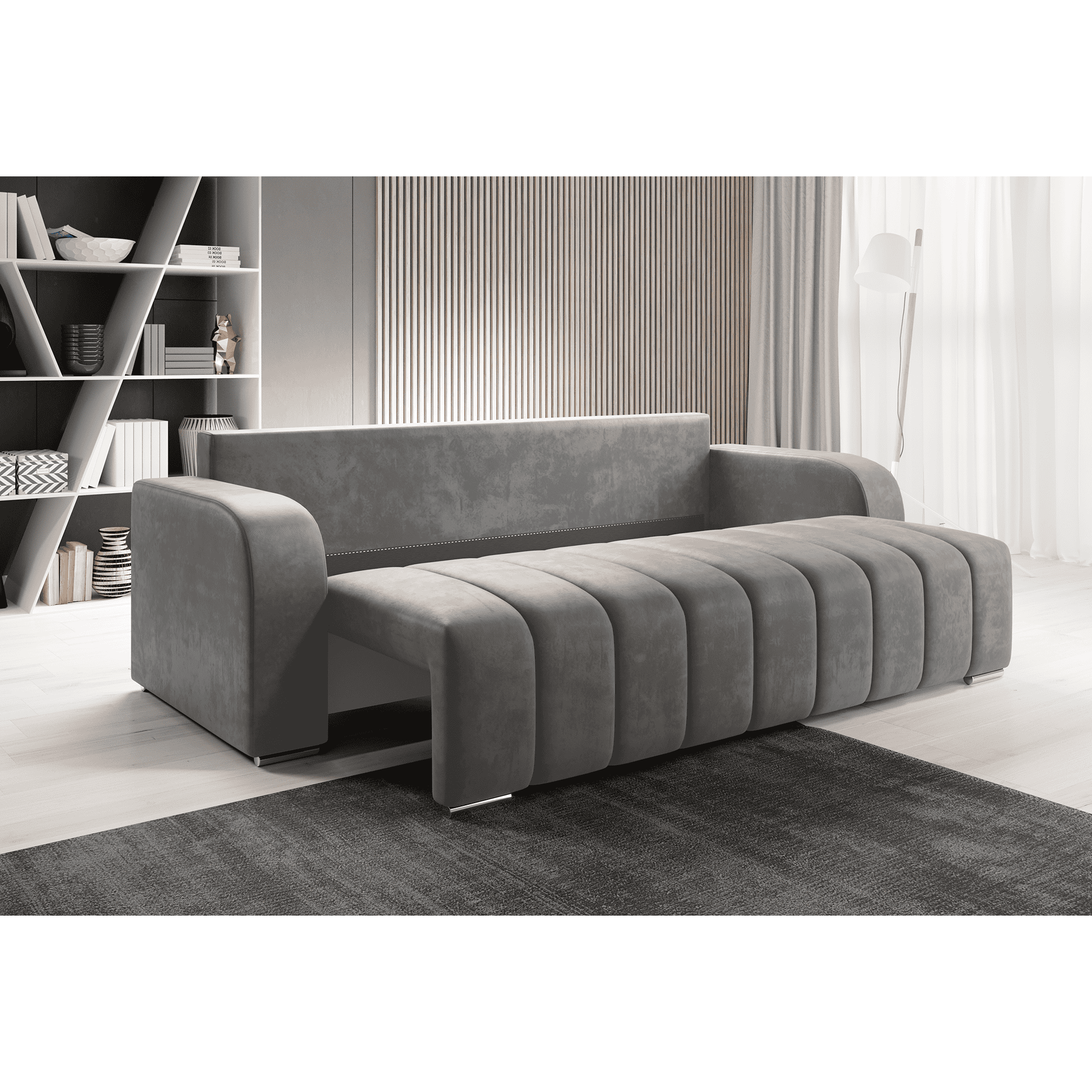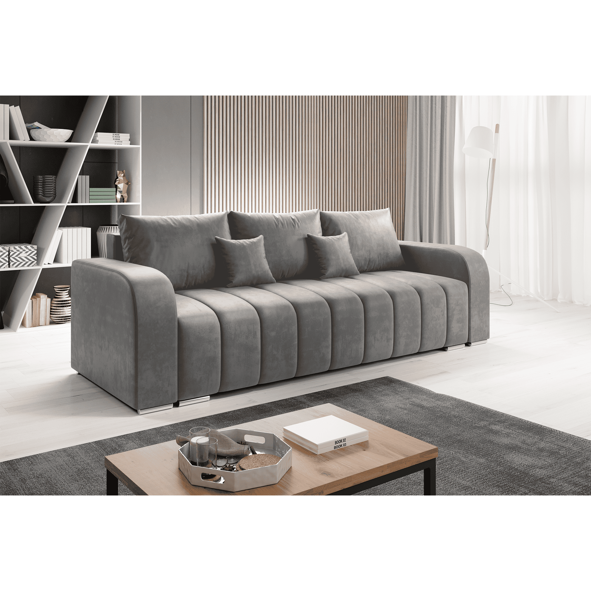 Material tapiţerie: Monolith 85 Rezistenţa la frecare a ţesăturii conform testului Martindale: 100.000 Culoare tapiţerie: gri Dimensiuni (LxAxÎ): 245x90x86 cm Suprafaţa pentru dormit (LxL): 140×200 cm Înălţime scaun: 47 cm Adâncime scaun: 57 cm Cu picioare Materialul picioarelor: plastic Culoare picioarelor: argintiu Înălţimea compartimentului inferior de la podea: 3 cm Capacitate de susţinere per persoană: 90 kg Umplutura: arcuri de oţel + spumă poliuretanică, Extensibilă, Tapiţată integral, Universală Cusături decorative, Material impermeabil, Cu spaţiu de depozitare, 3 perne mari 2 perne mici incluse în set, Dimensiuni perne mari (LxL): 67×50 cm Dimensiuni perne mici (LxL): 38×38 cm Se livrează dezasamblat