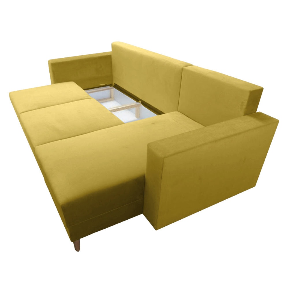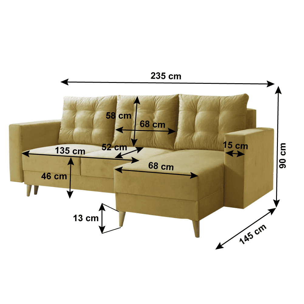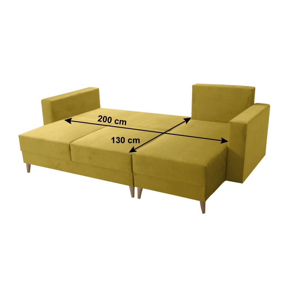 Material tapiţerie: ţesătură Kronos 11 Rezistenţa la frecare a ţesăturii conform testului Martindale: 50.000 Culoare tapiţerie: galbenă Dimensiuni (LxAxÎ): 235x145x90 cm Suprafaţa pentru dormit (LxL): 130×200 cm Înălţime scaun: 46 cm Adâncime scaun: 52 cm Lăţime otoman: 68 cm Lăţime scaun: 135 cm Lăţime cotieră: 15 cm Înălţimea compartimentului inferior de la podea: 13 cm Cu picioare de lemn Culoare picioare: fag Capacitate de susţinere per persoană: 90 kg Umplutura: arcuri ondulate + spumă poliuretanică, 3 perne incluse în set, Dimensiuni perne (LxL): 68×58 cm Colţar extensibil, Tapiţat integral, Cu spaţiu de depozitare, Dreapta, Livrat dezasamblat