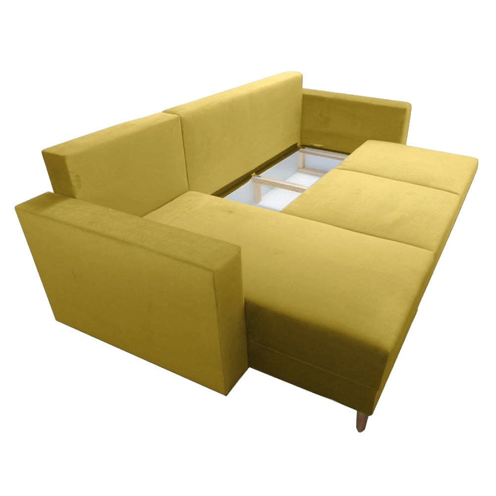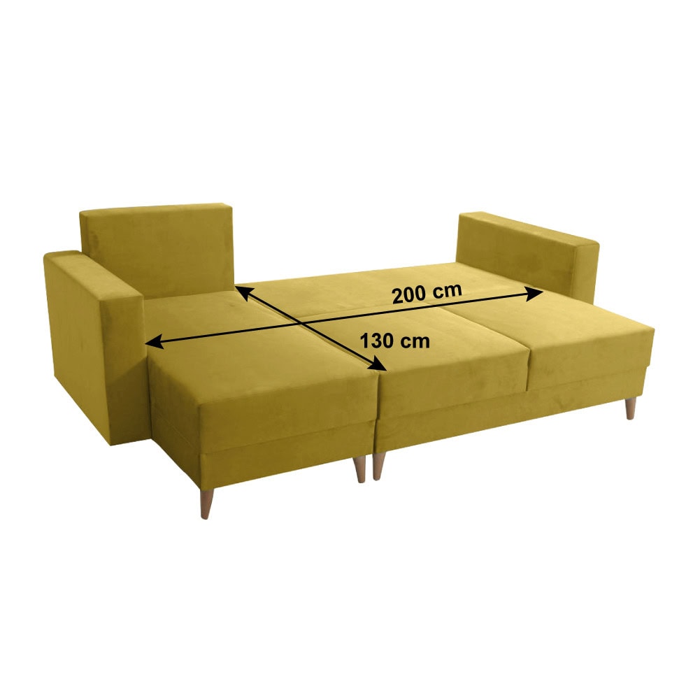 Material tapiţerie: ţesătură Kronos 11 Rezistenţa la frecare a ţesăturii conform testului Martindale: 50.000 Culoare tapiţerie: galbenă Dimensiuni (LxAxÎ): 235x145x90 cm Suprafaţa pentru dormit (LxL): 130×200 cm Înălţime scaun: 46 cm Adâncime scaun: 52 cm Lăţime otoman: 68 cm Lăţime scaun: 135 cm Lăţime cotieră: 15 cm Înălţimea compartimentului inferior de la podea: 13 cm Cu picioare de lemn Culoare picioare: fag Capacitate de susţinere per persoană: 90 kg Umplutura: arcuri ondulate + spumă poliuretanică, 3 perne incluse în set, Dimensiuni perne (LxL): 68×58 cm Colţar extensibil, Tapiţat integral, Cu spaţiu de depozitare, Stânga, Livrat dezasamblat