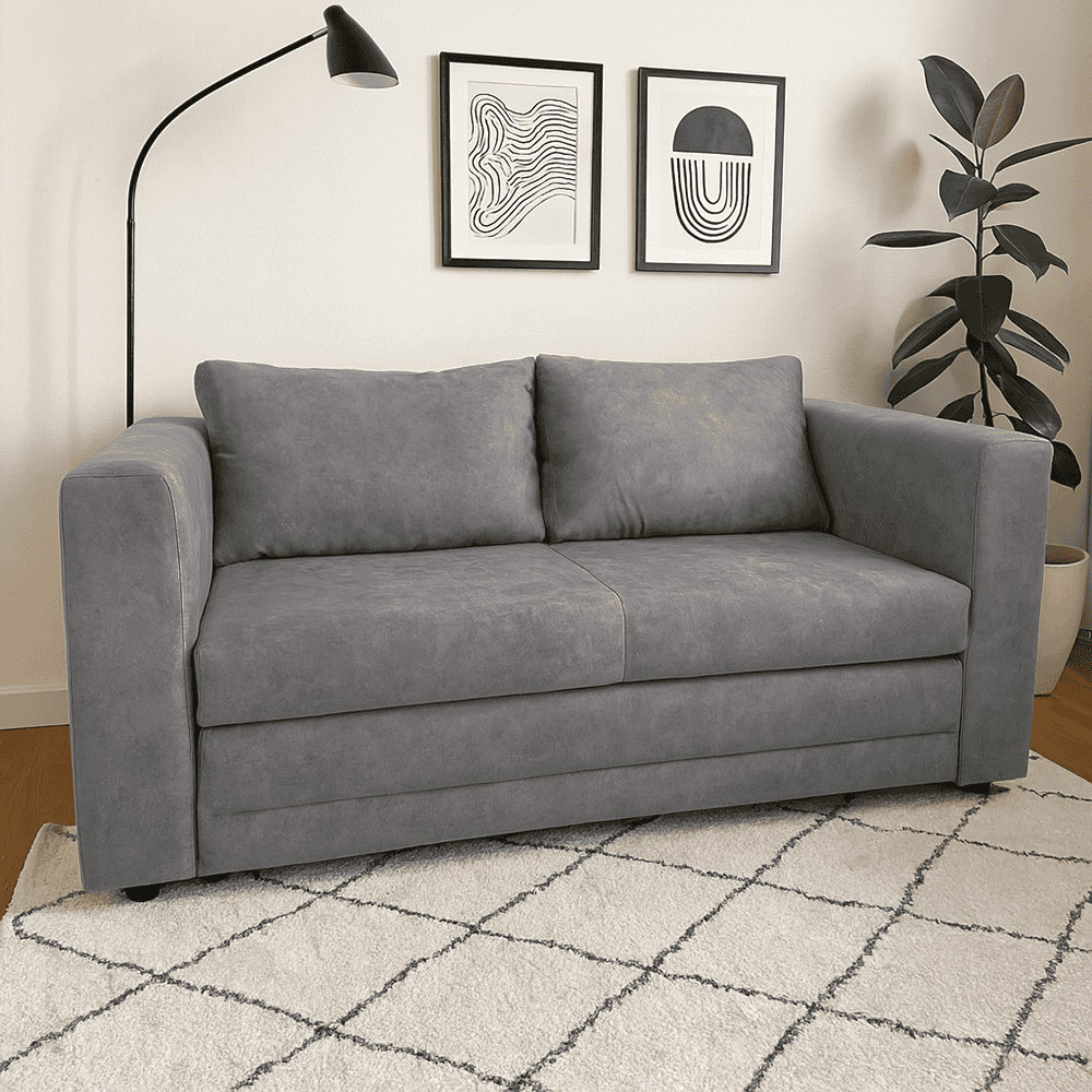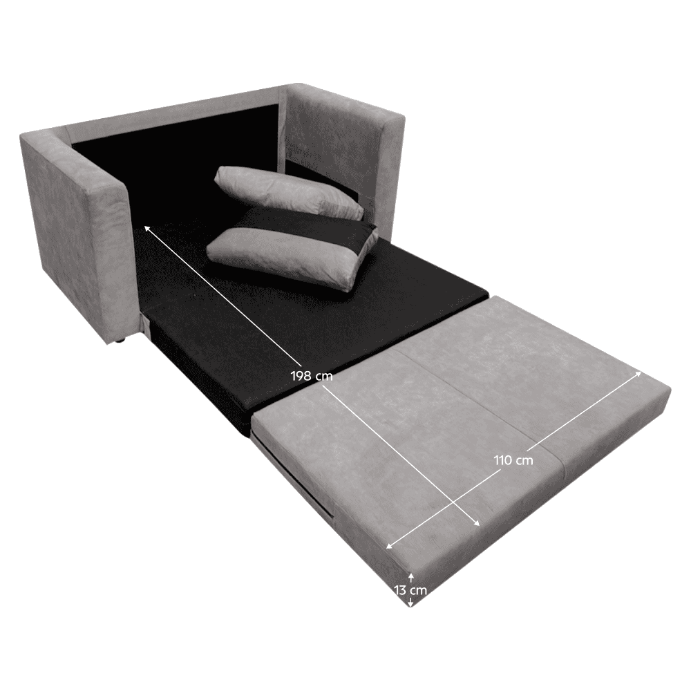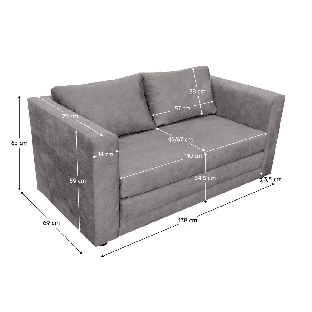 Material: ţesătură ENJOY 45/ Rezistenţa ţesăturii la frecare conform testului Martindale: 45 000 de cicluri de frecare Culoare: gri Dimensiuni (lxAxh): 138x69x63 cm Suprafaţa pentru dormit (lxL): 110×198 cm Înălţime părţii de şezut: 34,5 cm Adâncimea părţii de şedere cu perne: 45 cm Adâncimea părţii de şedere fără perne: 67 cm Lăţimea părţii de şezut: 100 cm Înălţimea părţii pentru dormit: 13 cm Grosime material construcţie: 2,2 cm Dimensiuni cotieră (lxAxh): 14x70x59 cm Pe picioare Material picioare: plastic Culoare picioare: neagră Înălţimea compartimentului inferior de la podea: 3,5 cm Umplutură: spumă PU Duritate: T25 Tapiţată integral Extensibilă Cu perne Dimensiuni perne (lxh): 57×38 cm Portanţă: 100 kg Greutate: 35 kg Practică Modernă Livrată dezasamblată