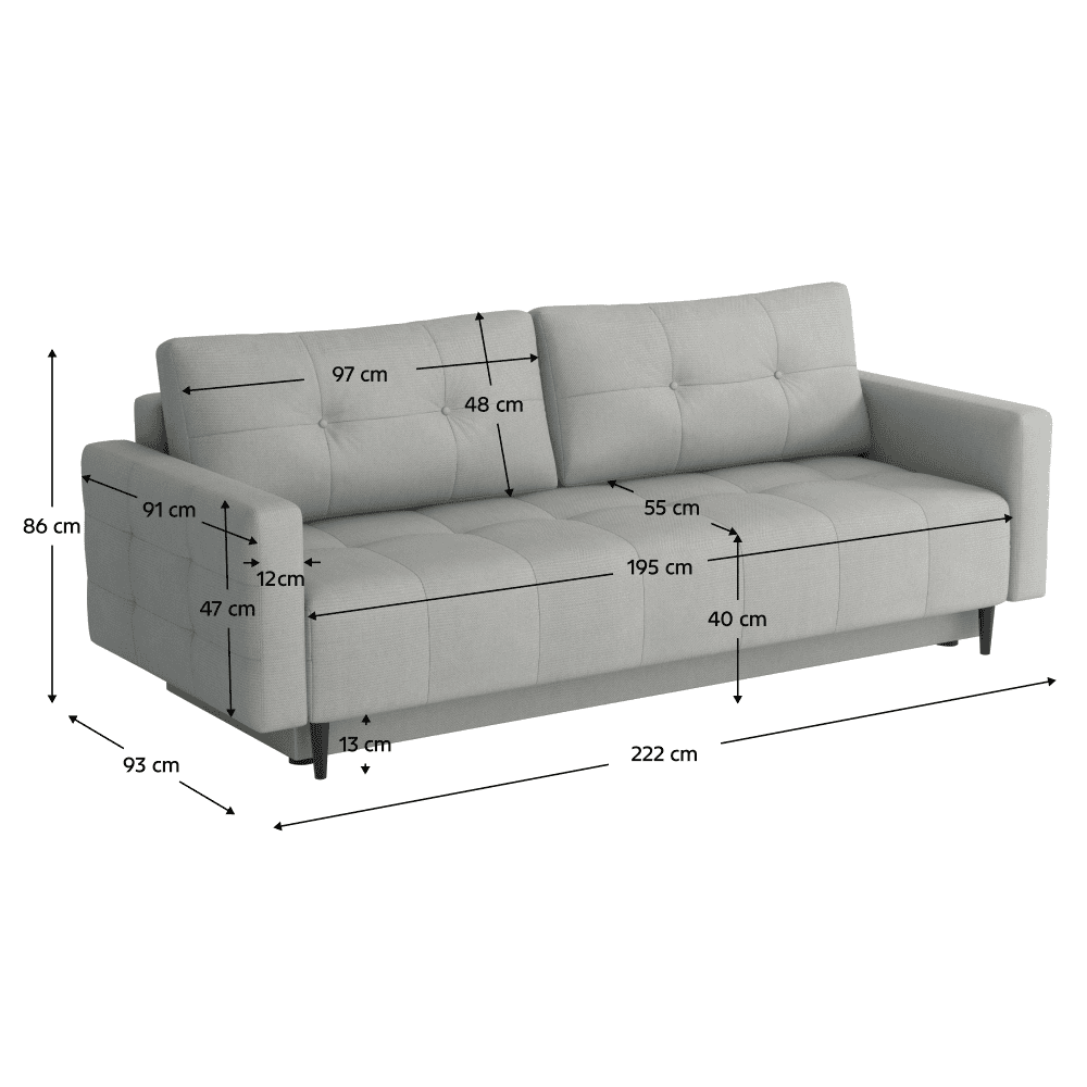 Material: ţesătură Paros 5 Rezistenţa ţesăturii la frecare conform testului Martindale: 50 000 de cicluri de frecare Culoare: gri deschis Dimensiuni (lxAxh): 222x93x86 cm Înălţimea părţii de şezut: 40 cm Adâncimea părţii de şezut: 55 cm Suprafaţa pentru dormit (lxL): 138×196 cm Dimensiuni cotieră (lxAxh): 12x91x47 cm Lăţimea părţii de şezut: 195 cm Pe picioare Materialul picioarelor: lemn Culoarea picioarelor: neagră Înălţimea picioarelor: 13 cm Umplutură: arc bonell Complet tapiţată Extensibilă Cu spaţiu de depozitare Cu perne Dimensiunile pernelor (lxh): 97×48 cm Portanţă pe persoană: 90 kg Practic Modern Livrat dezasamblat