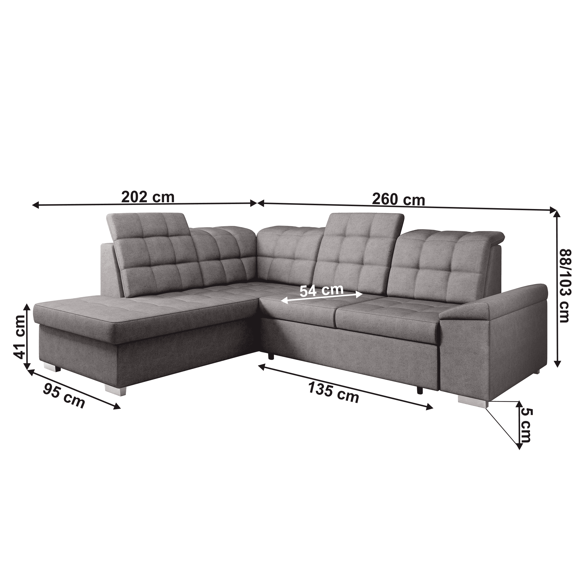 Material tapiţerie: ţesătură Soro 24 Rezistenţa la frecare a ţesăturii conform testului Martindale: 90.000 Culoare tapiţerie: gri-maroniu Dimensiuni (LxAxÎ): 260x202x88/103 cm Suprafaţa pentru dormit (LxL): 120×190 cm Înălţime scaun: 41 cm Adâncime scaun: 54 cm Lăţime otoman: 95 cm Lăţime scaun: 135 cm Cu picioare Materialul picioarelor: plastic Culoarea picioarelor: argintiu Înălţimea compartimentului inferior de la podea: 5 cm Capacitate de susţinere per persoană: 90 kg Umplutura: arcuri ondulate + spumă poliuretanică, Colţar extensibil tapiţat integral, Cu spaţiu de depozitare, Tetiere ajustabile, Variantă pentru partea stângă, Livrat dezasamblat, Posibilitatea de a alege dintre 7 nuanţe de culoare ale ţesăturii Soro la preţul de 7 535.- cu termenul de livrare de 6-8 săptămâni. La o comandă individuală, este necesară o plată în avans de 20% din suma respectivă. După achitarea avansului, comanda dumneavoastră va intra în producţie.