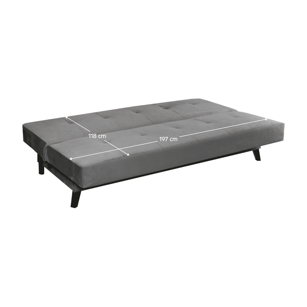 Material: ţesătură Trinity 15 Rezistenţa ţesăturii conform testului Martindale: 55.000 de cicluri de frecare Culoare: gri Dimensiuni (LxAxÎ): 197x84x92 cm Suprafaţa pentru dormit (LxL): 118×197 cm Înălţime scaun: 44 cm Adâncime scaun: 54 cm Capacitate de susţinere per persoană: 90 kg Miezul scaunului: arcuri buzunar / spumă poliuretanică Cu picioare Materialul picioarelor: lemn Culoarea picioarelor: neagră Înălţimea compartimentului inferior de la podea: 12,8 cm Extensibilă Compartiment de depozitare Material impermeabil Livrată dezasamblată