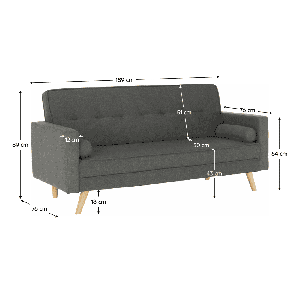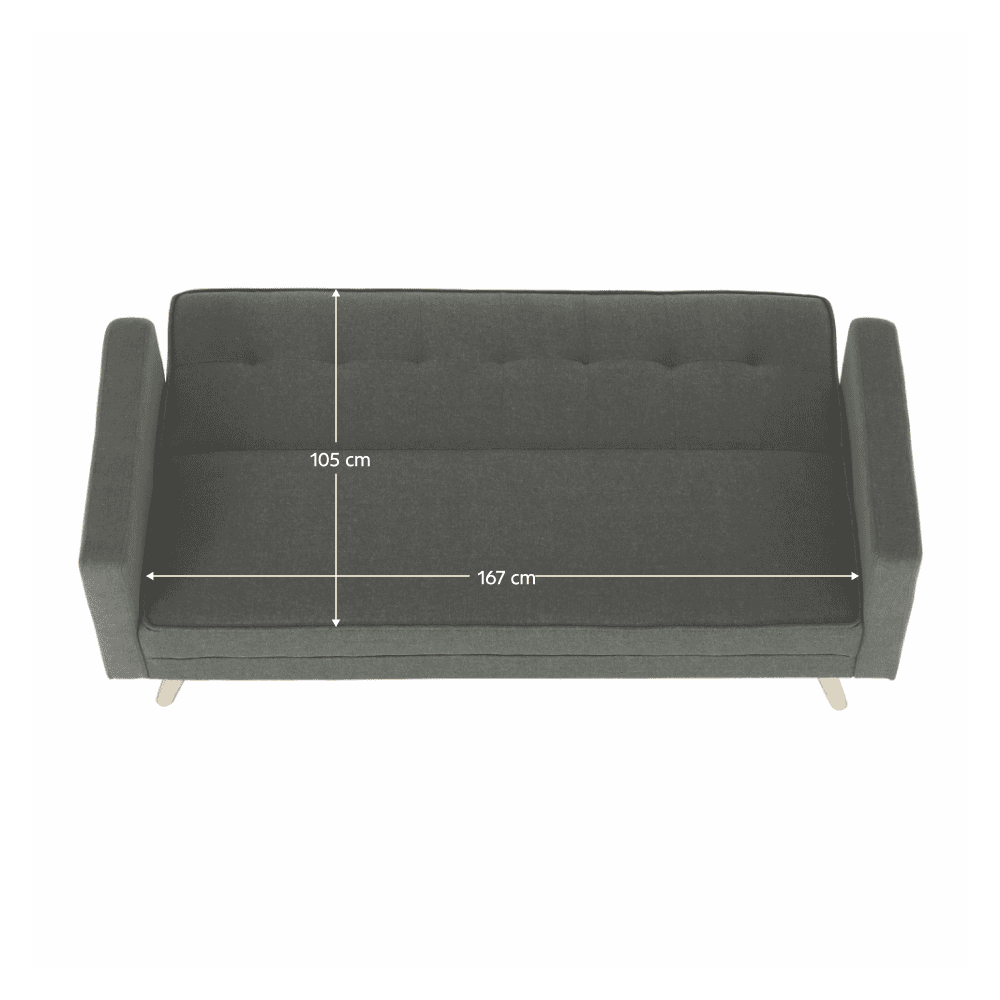 model: material gri, Dimensiuni (LxGxÎ): 186x75x89 cm, Spaţiu pt. dormit (LxG)167×105 cm , Înălţimea şezutului: 43 cm, Adâncimea şezutului: 50 cm. Greutate susţinută 160 kg.