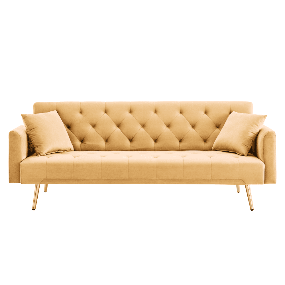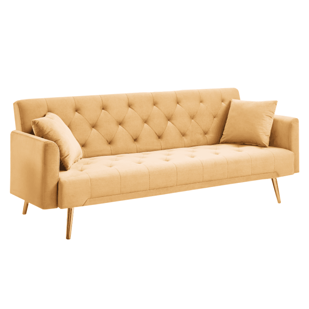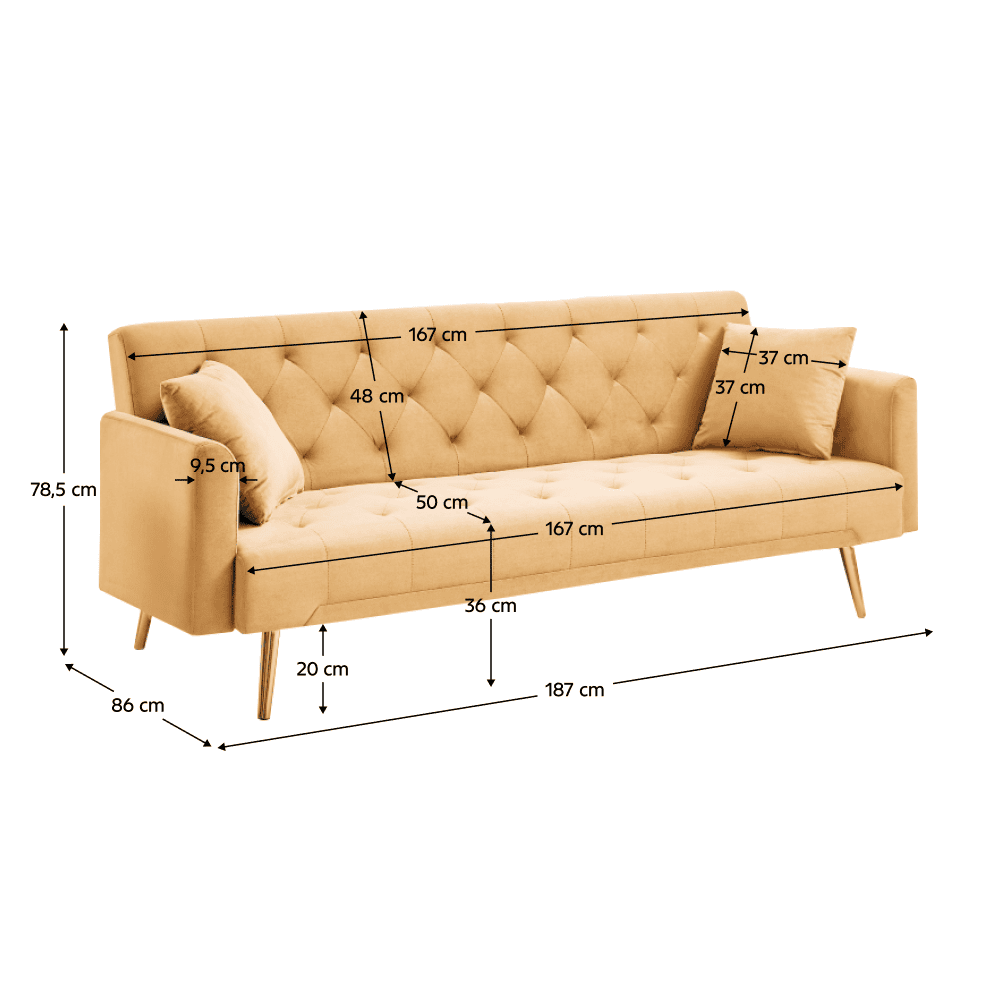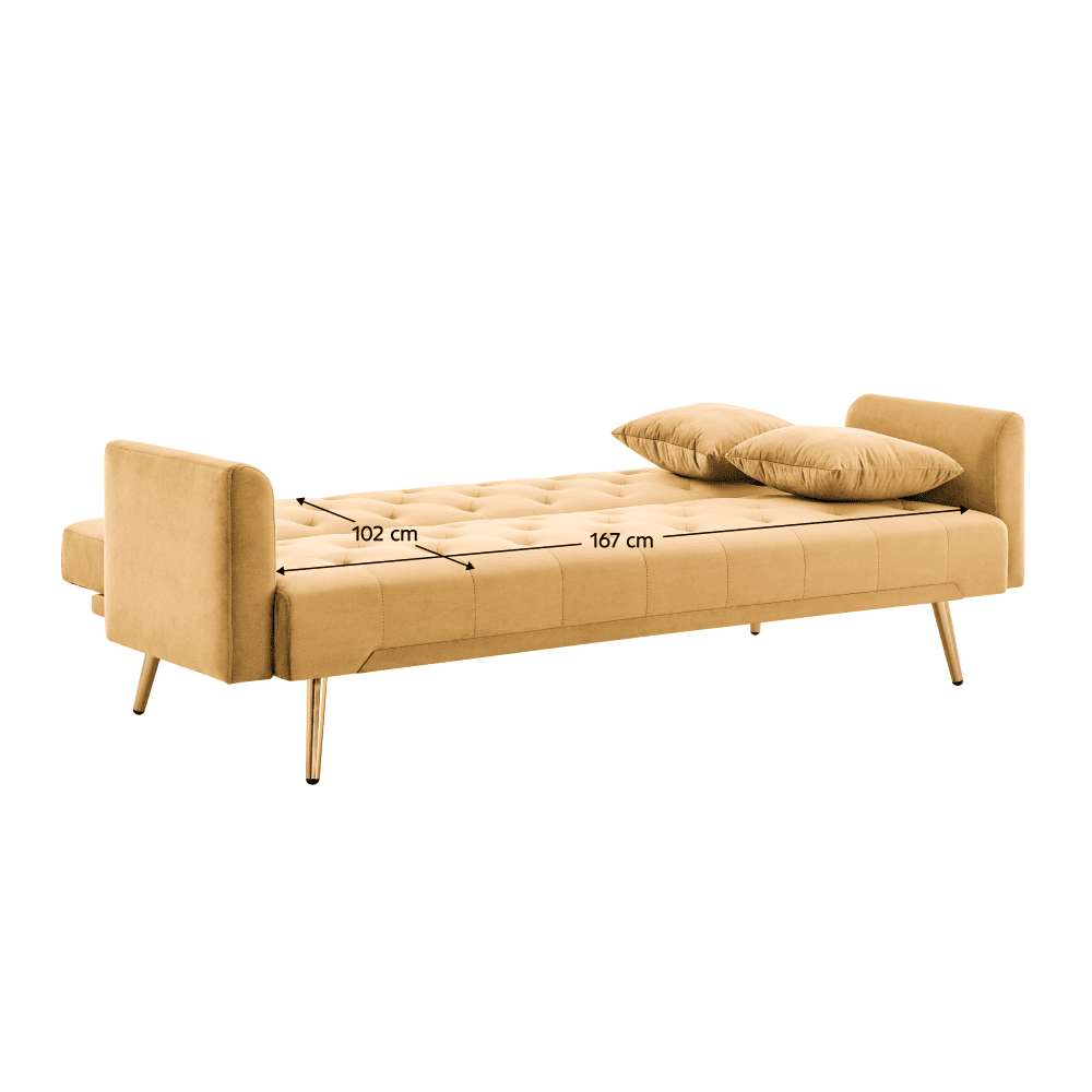 Material: ţesătura Velvet/lemn de eucalipt/metal Rezistenţa la frecare a ţesăturii conform testului Martindale: 80 000 de cicluri de frecare Culoare: muştar/gold crom-auriu Dimensiuni (lxAxh): 187x86x78,5 cm Suprafaţa pentru dormit (lxL): 102×167 cm Înălţimea părţii de şezut: 36 cm Adâncimea părţii de şezut: 50 cm Lăţimea părţii de şezut: 167 cm Lăţime spătar: 167 cm Înălţime spătar: 48 cm Înălţimea cotierei de la sol: 56 cm Înălţimea compartimentului inferior de la podea: 20 cm Portanţă pe persoană: 90 kg Pe picioare Cadru din lemn Umplutură: spumă Extensibilă Matlasată decorativă Se livrează cu perne Dimensiuni pernă (lxA): 37×37 cm Umplutură pernă: polipropilenă bumbac Husă detaşabilă pe perne Cu fermoar Se poate spăla la 30 °C Practică Modernă Livrată dezasamblată