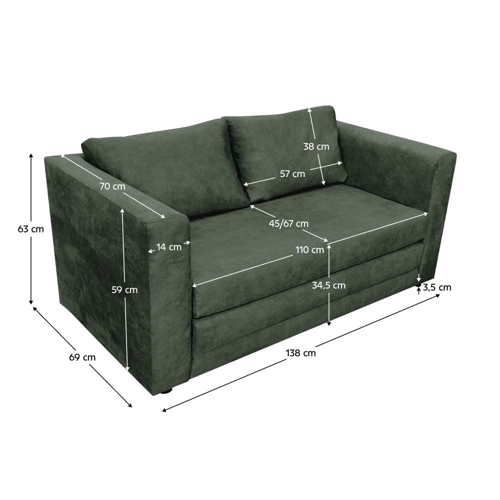 Material: ţesătură ENJOY 47/pin Rezistenţa ţesăturii la frecare conform testului Martindale: 45 000 de cicluri de frecare Culoare: verde Dimensiuni (lxAxh): 138x69x63 cm Suprafaţa pentru dormit (lxL): 110×198 cm Înălţime părţii de şezut: 34,5 cm Adâncimea părţii de şedere cu perne: 45 cm Adâncimea părţii de şedere fără perne: 67 cm Lăţimea părţii de şezut: 100 cm Înălţimea părţii pentru dormit: 13 cm Grosime material construcţie: 2,2 cm Dimensiuni cotieră (lxAxh): 14x70x59 cm Pe picioare Material picioare: plastic Culoare picioare: neagră Înălţimea compartimentului inferior de la podea: 3,5 cm Umplutură: spumă PU Duritate: T25 Tapiţată integral Extensibilă Cu perne Dimensiuni perne (lxh): 57×38 cm Portanţă: 100 kg Greutate: 35 kg Practică Modernă Livrată dezasamblată