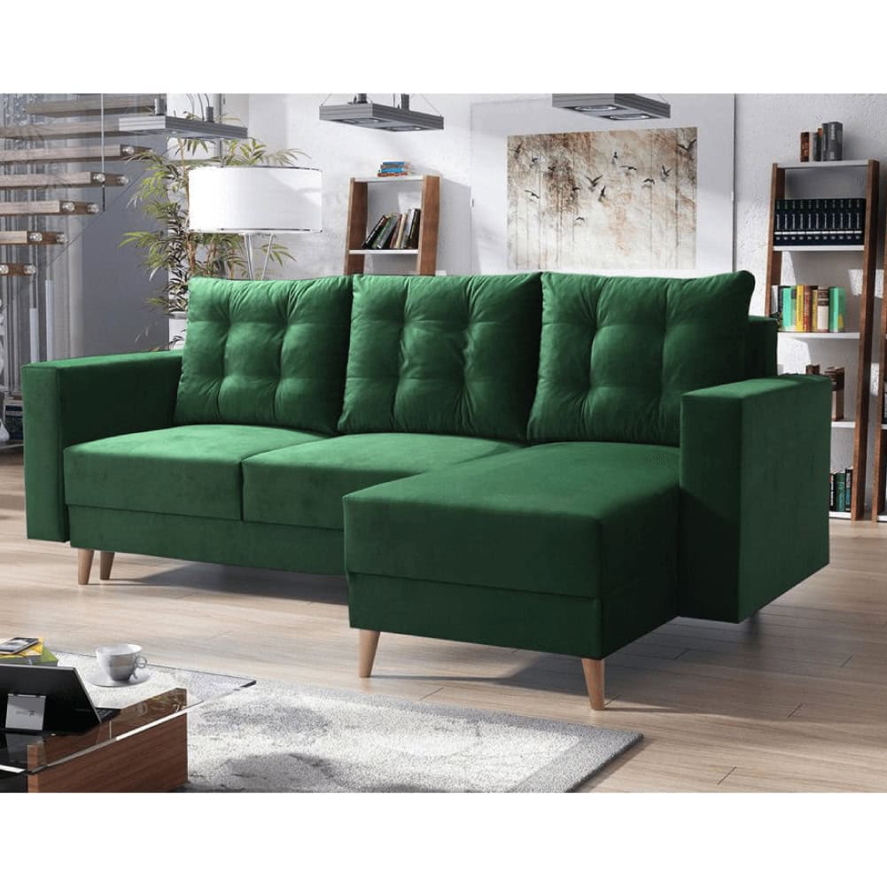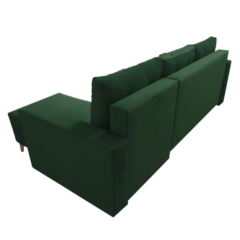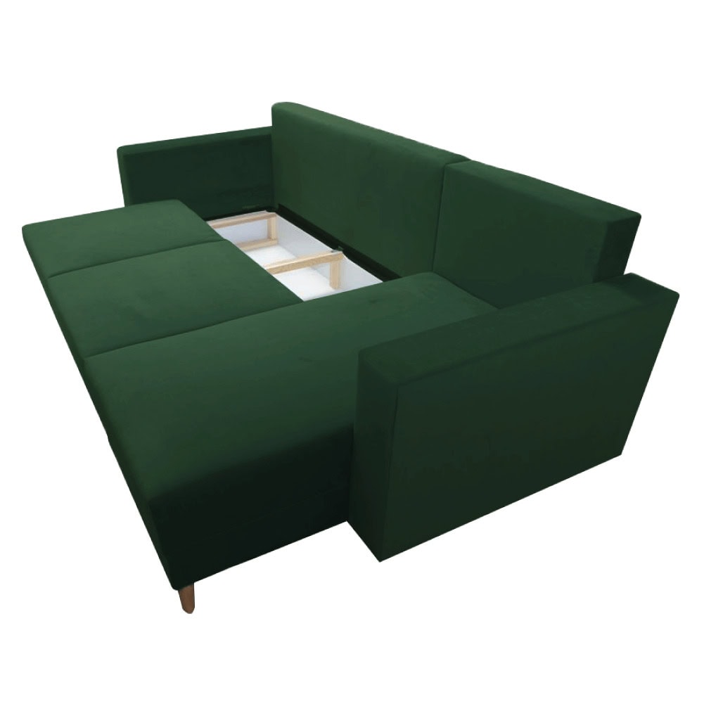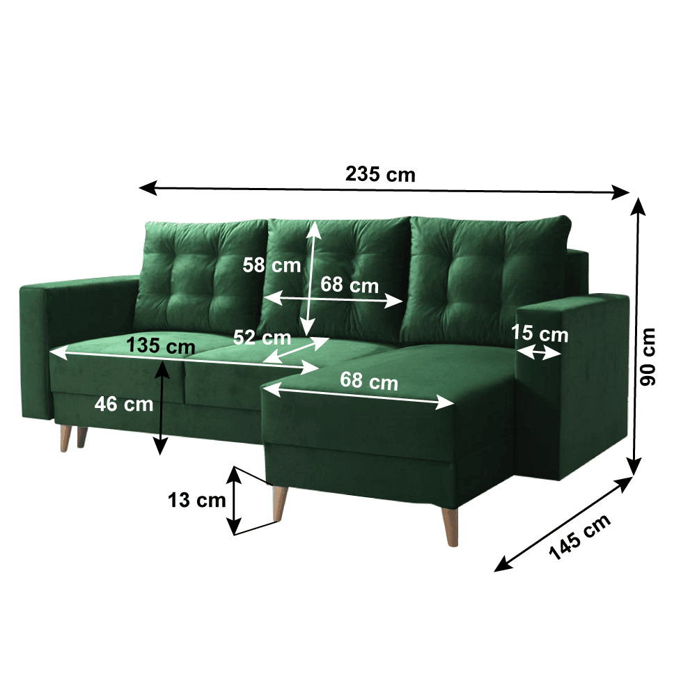 Material tapiţerie: ţesătură Kronos 19 Rezistenţa la frecare a ţesăturii conform testului Martindale: 50.000 Culoare tapiţerie: verde Dimensiuni (LxAxÎ): 235x145x90 cm Suprafaţa pentru dormit (LxL): 130×200 cm Înălţime scaun: 46 cm Adâncime scaun: 52 cm Lăţime otoman: 68 cm Lăţime scaun: 135 cm Lăţime cotieră: 15 cm Înălţimea compartimentului inferior de la podea: 13 cm Cu picioare de lemn Culoare picioare: fag Capacitate de susţinere per persoană: 90 kg Umplutura: arcuri ondulate + spumă poliuretanică, 3 perne incluse în set, Dimensiuni perne (LxL): 68×58 cm Colţar extensibil, Tapiţat integral, Cu spaţiu de depozitare, Dreapta, Livrat dezasamblat