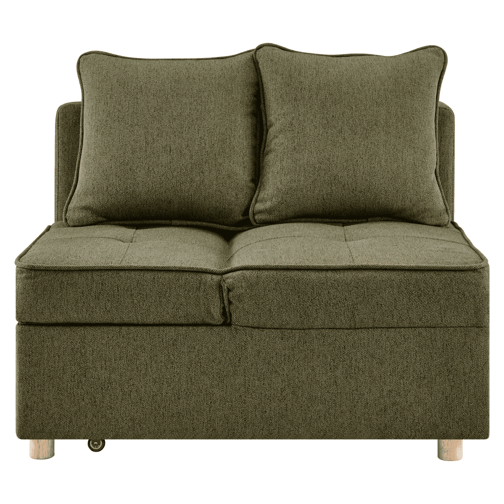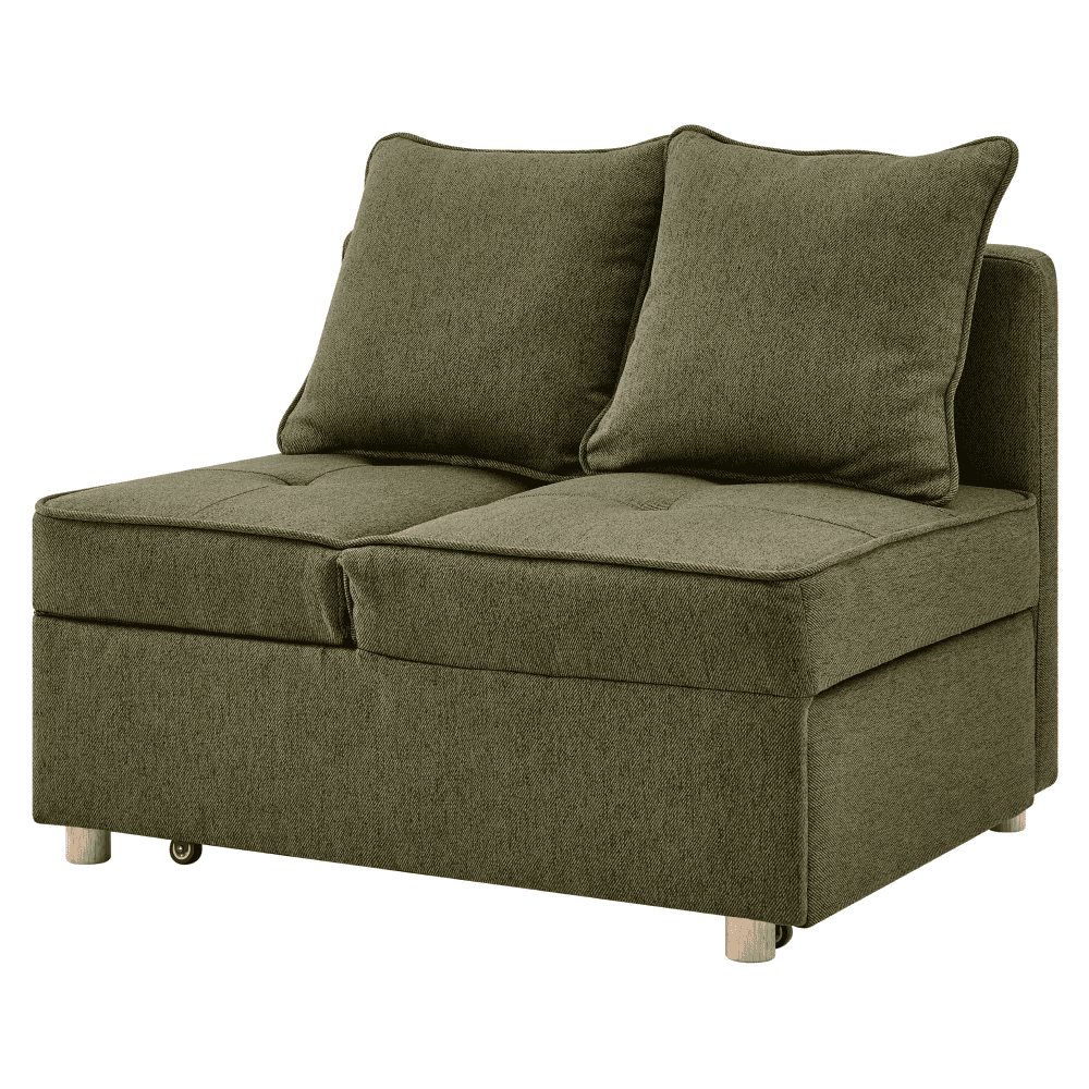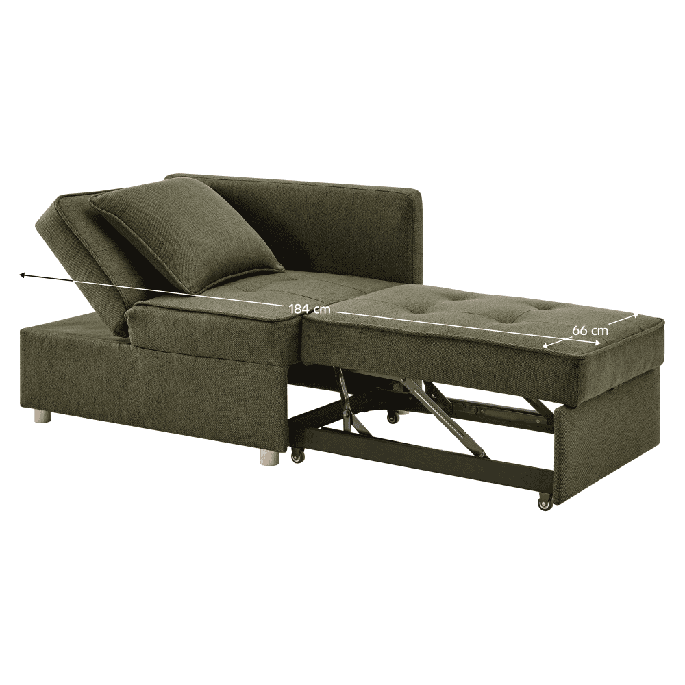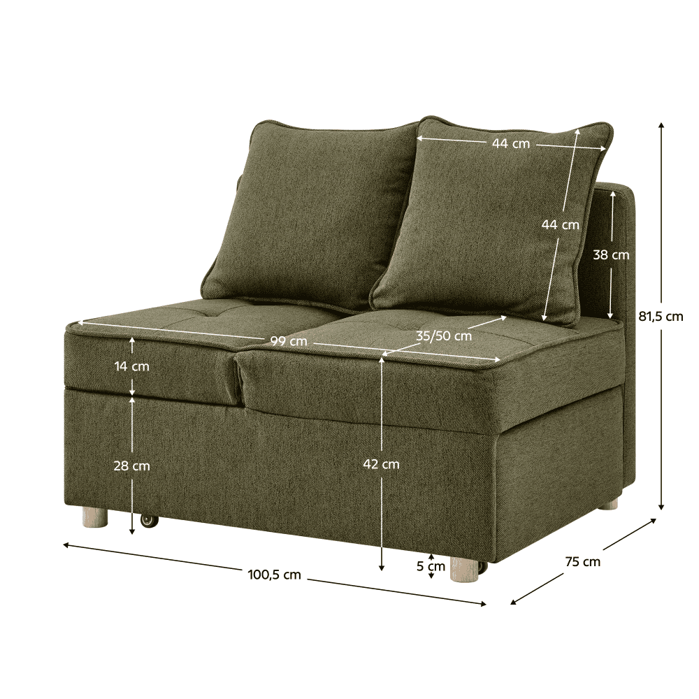 Material: ţesătură Neve 39/lemn/metal Rezistenţa ţesăturii la frecare conform testului Martindale: 80 000 de cicluri de frecare Culoare: verde Dimensiuni (lxAxh): 100,5x75x81,5 cm Suprafaţa pentru dormit (lxL): 66×184 cm Înălţimea părţii de şezut: 42 cm Înălţimea părţii de şezut fără saltea: 28 cm Adâncime părţii de şezut: 35 cm Adâncimea părţii de şezut fără perne: 50 cm Lăţimea părţii de şezut: 99 cm Lăţime după extindere: 184 cm Înălţime spătar: 38 cm Lăţime spătar: 99 cm Înălţimea saltelei: 14 cm Portanţă: 90 cm Cu picioare Material picioare: lemn de fag Culoare picioare: naturală Înălţimea compartimentului inferior de la podea: 5 cm Canapea cu 2 locuri Complet tapiţată Extensibilă Tetieră reglabilă în 5 poziţii de poziţionare Livrată cu perne Dimensiuni perne (lxAxh): 44x15x44 cm Cusătură decorativă Practică, Design modern şi practic Livrată dezasamblată