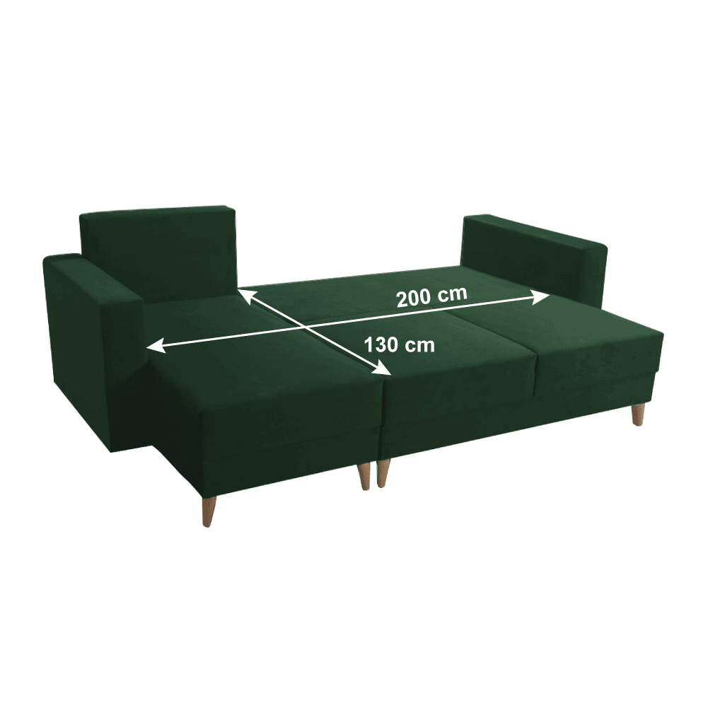 Material tapiţerie: ţesătură Kronos 19 Rezistenţa la frecare a ţesăturii conform testului Martindale: 50.000 Culoare tapiţerie: verde Dimensiuni (LxAxÎ): 235x145x90 cm Suprafaţa pentru dormit (LxL): 130×200 cm Înălţime scaun: 46 cm Adâncime scaun: 52 cm Lăţime otoman: 68 cm Lăţime scaun: 135 cm Lăţime cotieră: 15 cm Înălţimea compartimentului inferior de la podea: 13 cm Cu picioare de lemn Culoare picioare: fag Capacitate de susţinere per persoană: 90 kg Umplutura: arcuri ondulate + spumă poliuretanică, 3 perne incluse în set, Dimensiuni perne (LxL): 68×58 cm Colţar extensibil, Tapiţat integral, Cu spaţiu de depozitare, Stânga, Livrat dezasamblat