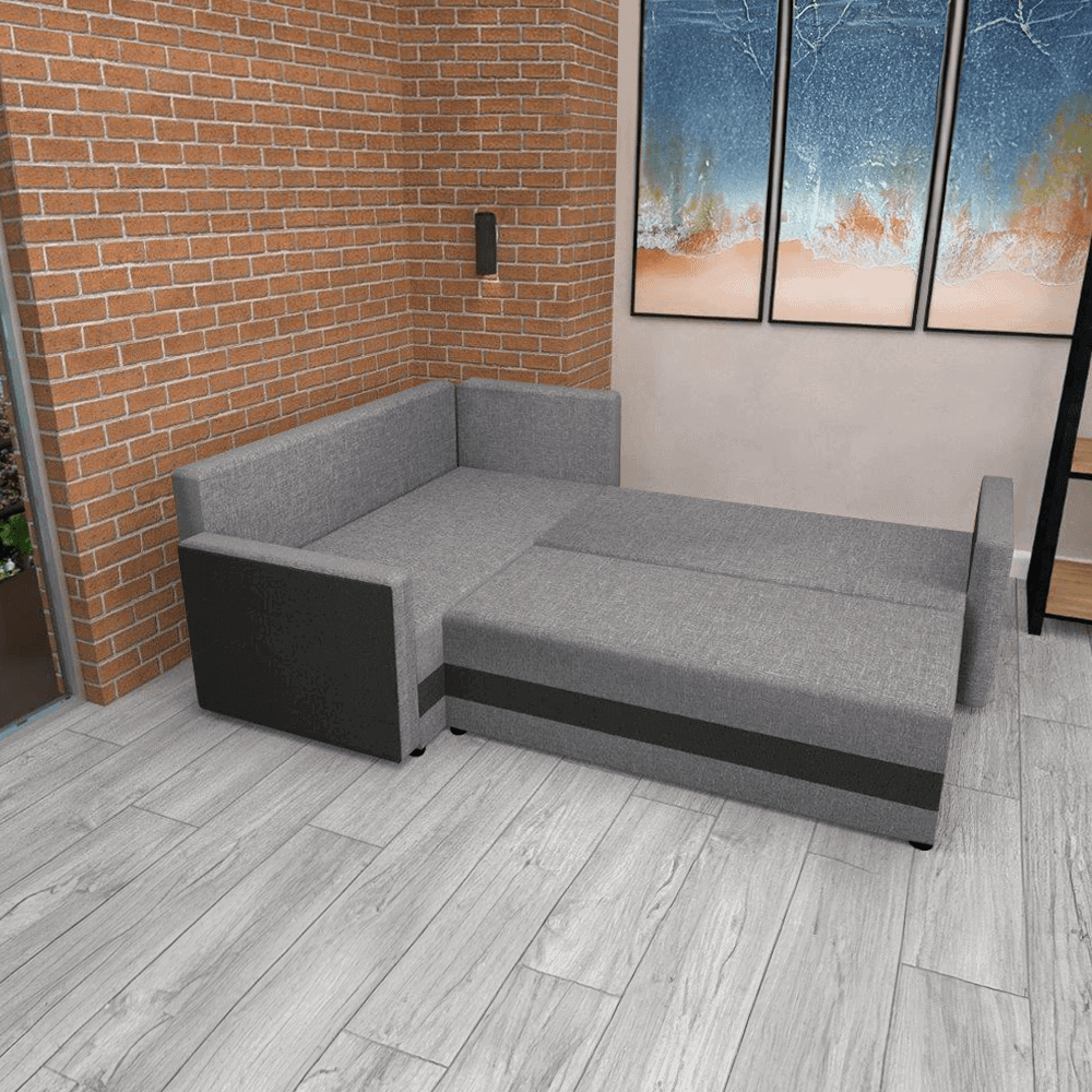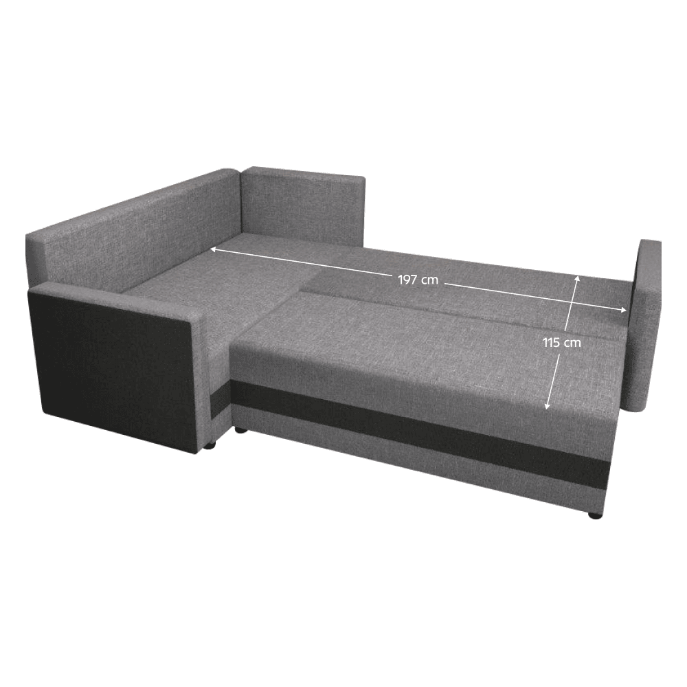 Material tapiţerie: ţesătură Savana 14/21 Rezistenţa ţesăturii conform testului Martindale: 80.000 de cicluri de frecare Culoare tapiţerie: neagră / gri Dimensiuni (LxAxÎ): 214×144/71×73 cm Suprafaţa pentru dormit (LxL): 115×197 cm Dimensiuni cotieră (LxA): 10×75 cm Înălţimea scaunului: 39 cm Adâncime scaun: 45/65 cm Cu picioare din plastic Culoare picioare: neagră Înălţimea spaţiului inferior de la podea: 2,5 cm Umplutură: spumă poliuretanică Extensibilă Colţar Universală (stânga / dreapta) Cu spaţiu de depozitare Furnizată cu cinci perne Dimensiuni pernă (LxL): 64×46 cm Livrată dezasamblată