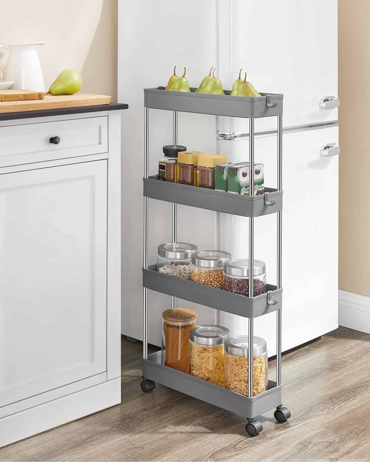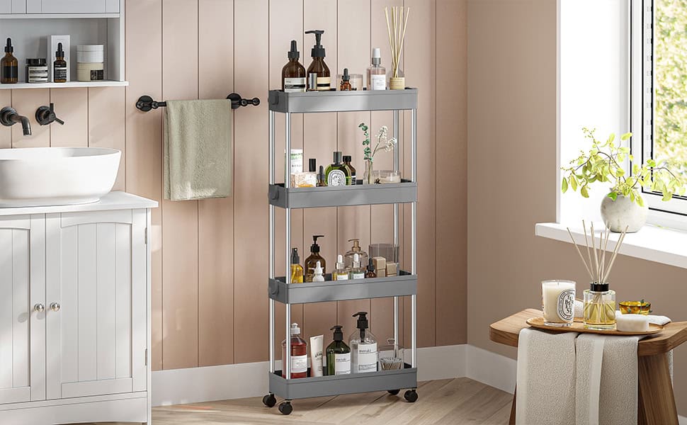 Carucior de depozitare pe roti, pentru bucatarie sau baie, din plastic, cu 4 nivele, 40x13x88cm, gri Mob360 – produs disponibil în magazinul Mob360.