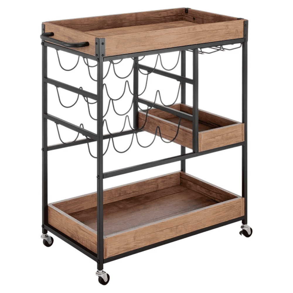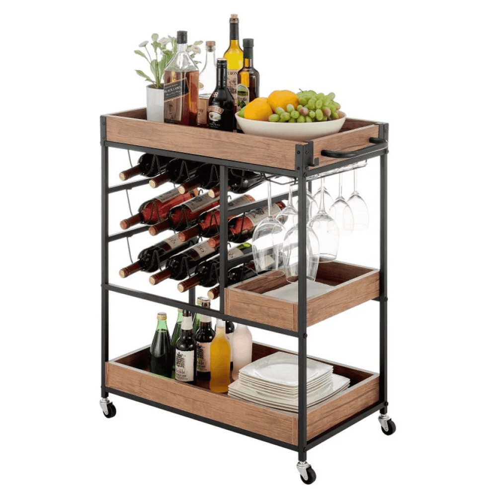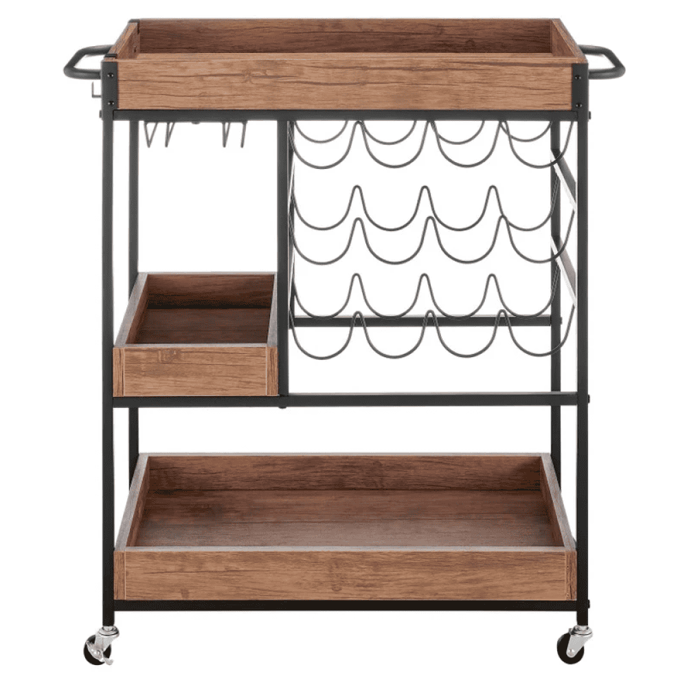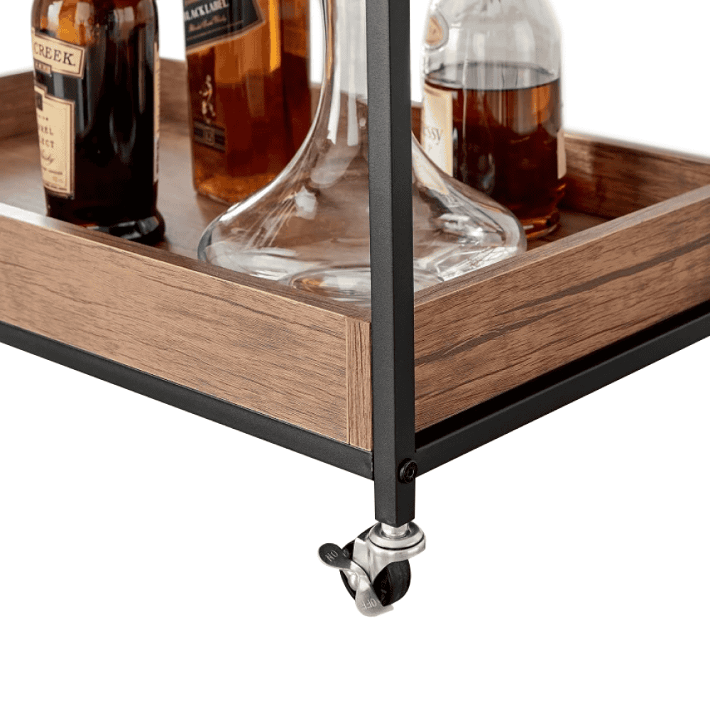 Raftul superioară poate fi folosită ca tavă sau platou Suport pentru sticle Suport pentru pahare Suport pentru prosoape lateral Cârlig pentru prosop Mobile Cu roţi 2 roţi cu frâne Ajutor multifuncţional Stil rustic Livrat dezasamblat