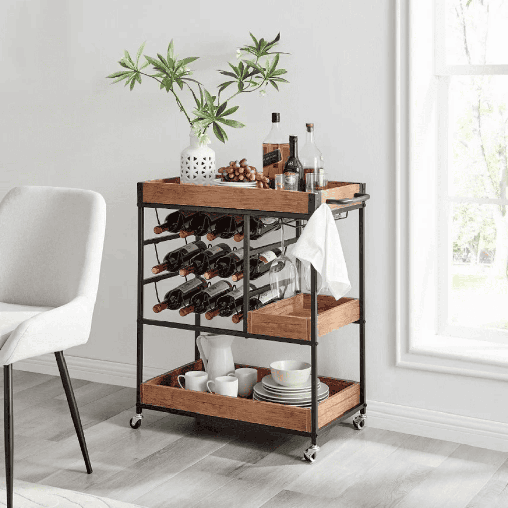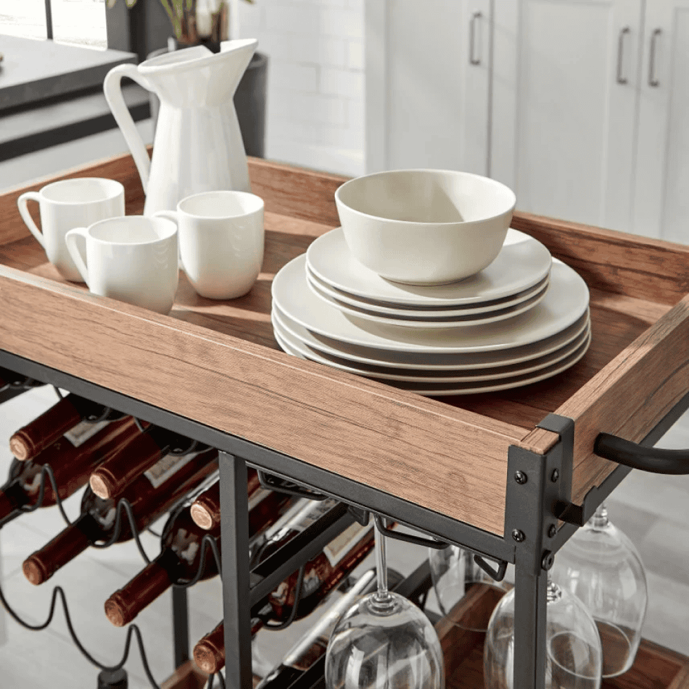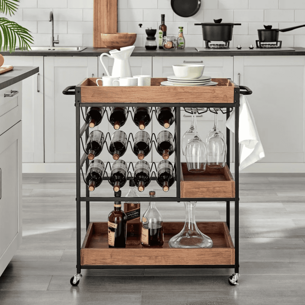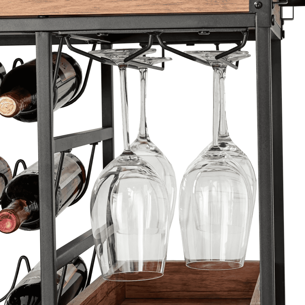 Raftul superioară poate fi folosită ca tavă sau platou Suport pentru sticle Suport pentru pahare Suport pentru prosoape lateral Cârlig pentru prosop Mobile Cu roţi 2 roţi cu frâne Ajutor multifuncţional Stil rustic Livrat dezasamblat